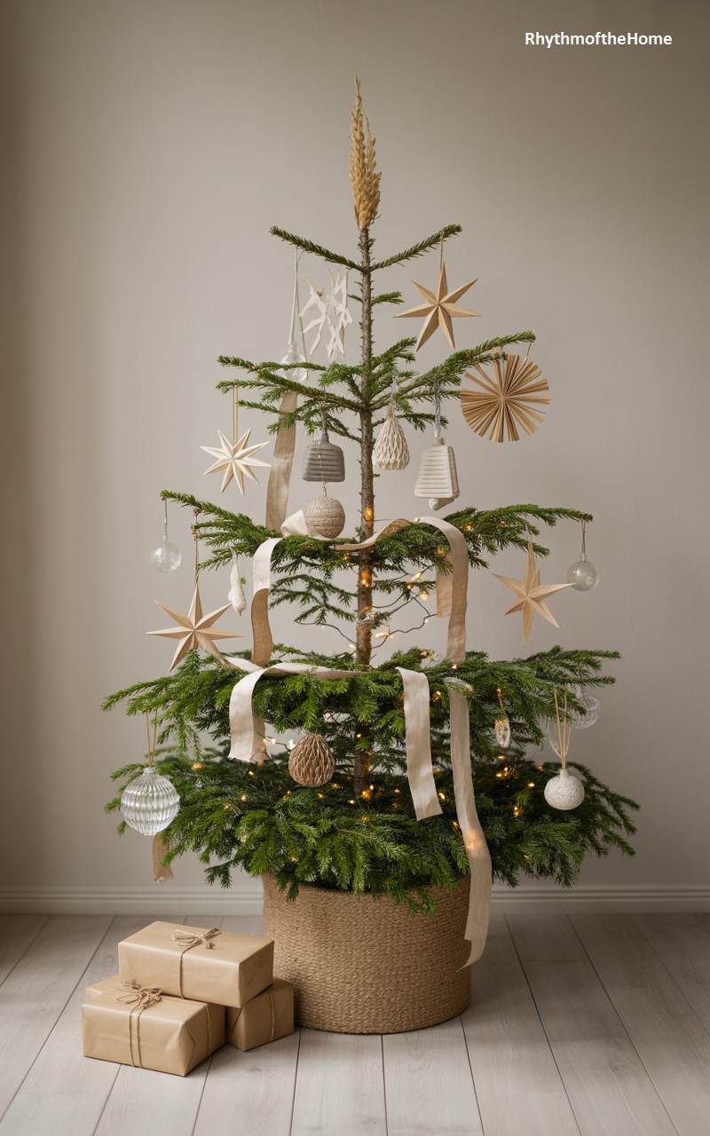 This beautiful Christmas tree embodies the essence of Scandinavian holiday style—natural, simple, and full of handcrafted charm. The tree itself has a lovely, open-branched structure, allowing each ornament to be seen and appreciated. It is adorned with a delightful collection of straw stars, paper ornaments, and simple woven baubles in a neutral color palette. A wide, cream-colored ribbon is draped gracefully through the branches, and a string of warm white lights adds a cozy glow. Housed in a simple woven basket and surrounded by presents wrapped in brown paper, this tree is a testament to understated, heartfelt elegance.