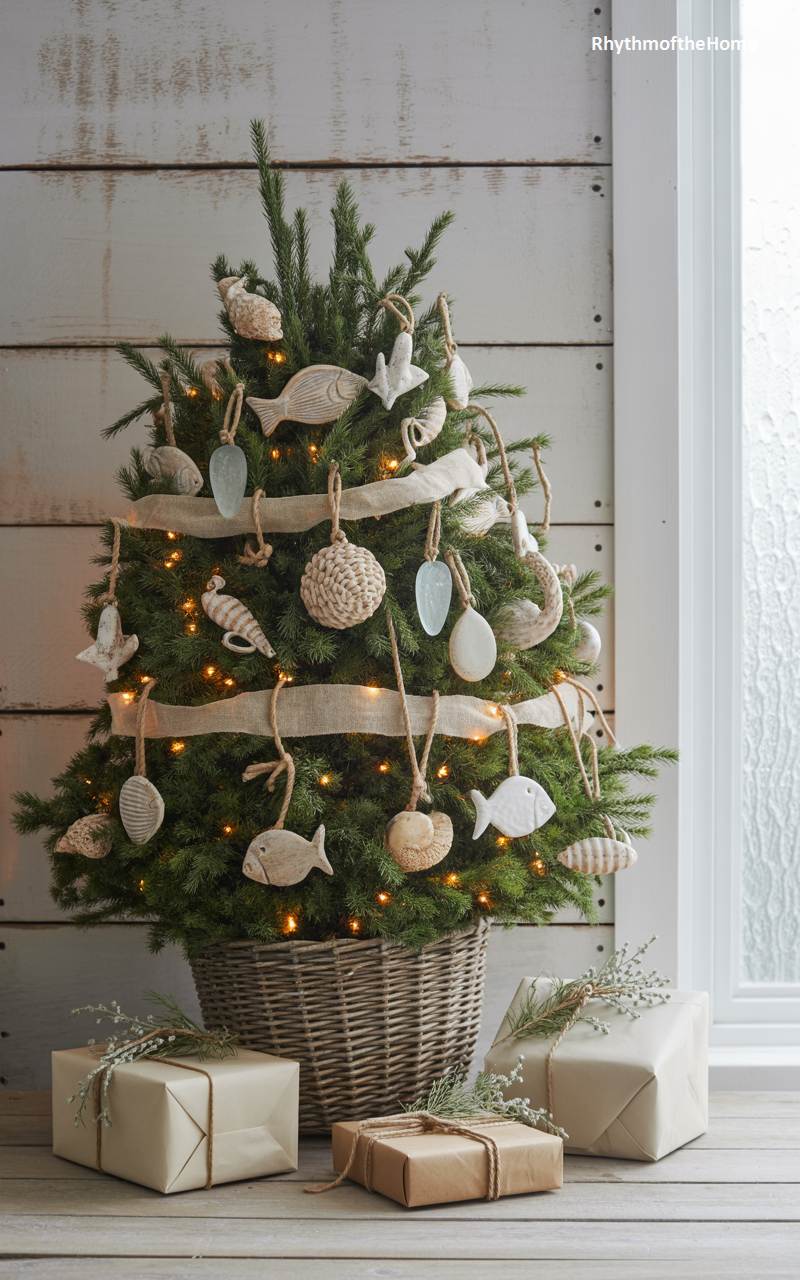 Capturing the serene and rustic beauty of the seaside, this Christmas tree is decorated with a charming coastal theme. Nestled in a simple wicker basket, the tree is adorned with ornaments inspired by the ocean: delicate ceramic fish, textured seashell shapes, and smooth, sea-glass-like pendants. A natural, jute-like ribbon is woven through the branches, adding to the rustic, beachy feel. Warm lights provide a gentle glow, reminiscent of a soft sunset over the water. Surrounded by simply wrapped gifts, this tree is a perfect tribute to a Christmas spent by the shore.