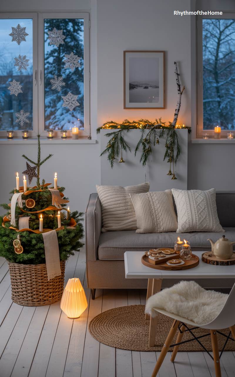 This cozy corner is the epitome of “hygge,” the Danish concept of comfort and contentment. The Christmas tree, nestled in a wicker basket, is uniquely decorated with real candles clipped to its branches, a classic Scandinavian tradition. It’s also adorned with dried orange slices and a simple linen ribbon, emphasizing natural beauty. A soft glow emanates from a pleated paper lamp on the floor, while a comfortable grey sofa with knit pillows invites you to relax. The windows, decorated with paper snowflakes and lined with candles, look out onto a snowy evening, completing this perfectly peaceful and heartwarming holiday scene.