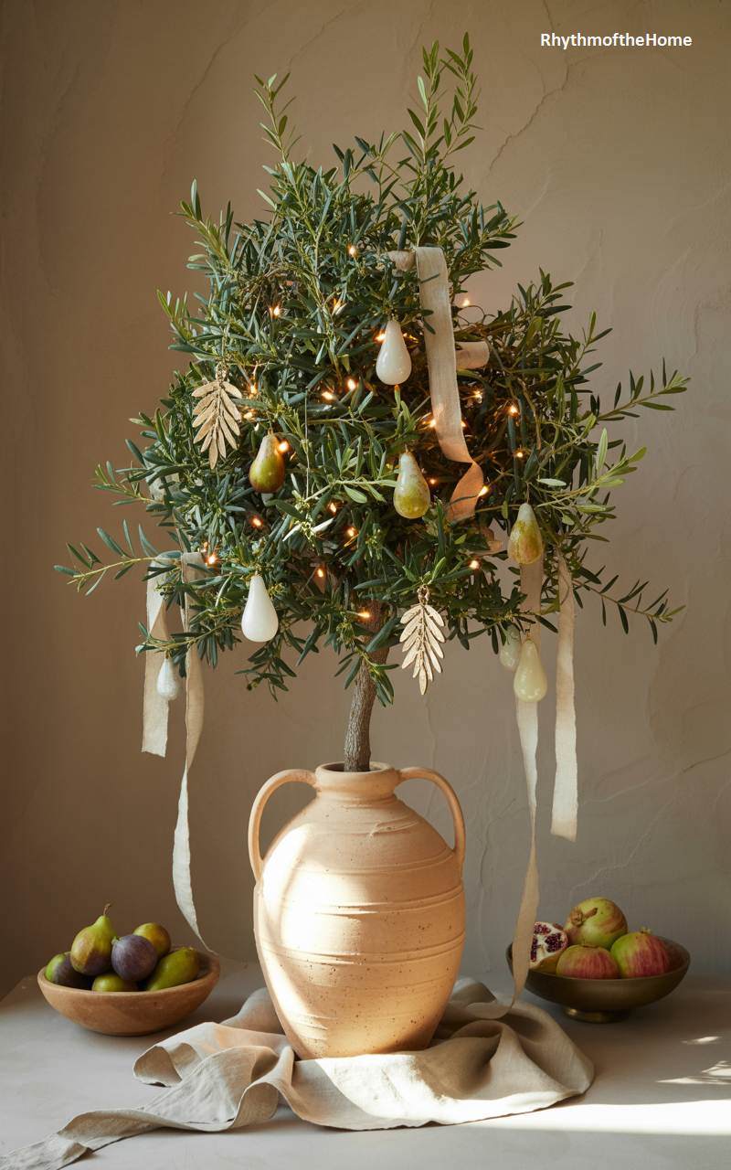 This charming and unique Christmas display features a small, potted olive tree as its centerpiece, celebrating a Mediterranean holiday aesthetic. The tree’s silvery-green leaves are illuminated by a delicate string of fairy lights and adorned with lovely pear-shaped ornaments and golden leaf decorations. A simple cream-colored ribbon is tied loosely among its branches. The tree sits in a beautiful terracotta amphora-style pot, surrounded by bowls of fresh figs and pears. This arrangement is a wonderfully fresh and elegant alternative to a traditional Christmas tree, full of rustic, sun-kissed charm.