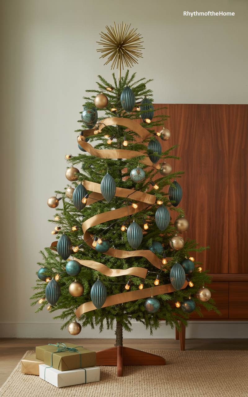 This Christmas tree is a masterclass in mid-century modern holiday style. The tree has a classic, natural shape, which serves as the perfect canvas for its stylish decorations. The color palette is a sophisticated blend of gold and deep teal. The ornaments include classic round baubles and elongated, finial-style shapes that evoke the design of the era. A wide, matte gold ribbon is draped in loose swags, and a stunning sputnik-style star tops the tree. Set against a backdrop of a warm wood credenza, this tree is the perfect fusion of festive tradition and iconic mid-century design.