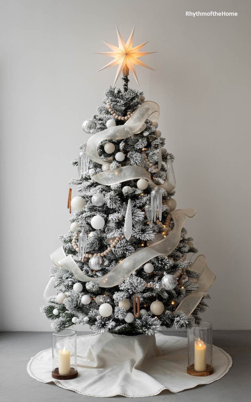 This breathtaking Christmas tree is a winter wonderland dream, exuding elegance and magical charm. The heavily flocked branches give the impression of a tree covered in fresh, glistening snow. The decorations are a pristine and shimmering palette of white, silver, and crystal. White and silver baubles, beaded garlands, and sparkling icicle ornaments hang from the branches, while a wide, translucent white ribbon with a gold edge cascades down the tree. A glowing star tops it all off, and two large pillar candles in hurricanes at its base add to the warm, ethereal glow of this stunningly beautiful holiday centerpiece.