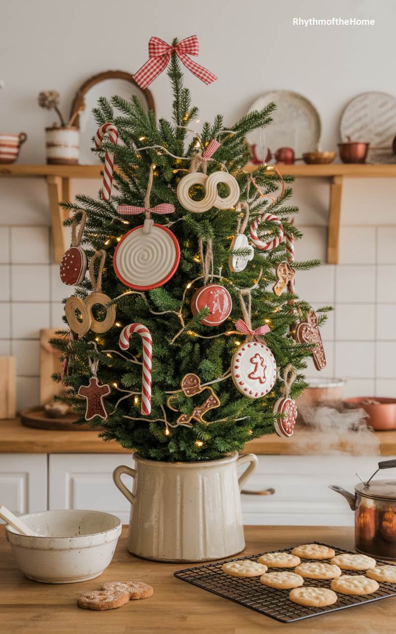 This delightful tabletop Christmas tree is a sweet and whimsical tribute to the joys of holiday baking. Placed in a rustic stoneware crock, its cheerful green branches are adorned with an array of charming, cookie-themed ornaments. Iced gingerbread men, candy canes, and ceramic ornaments shaped like classic Christmas cookies hang alongside red and white ribbons. The tree sits on a kitchen counter next to a cooling rack of freshly baked butter cookies and a steaming kettle, creating a heartwarming scene that perfectly captures the delicious scents and happy traditions of a Christmas kitchen.