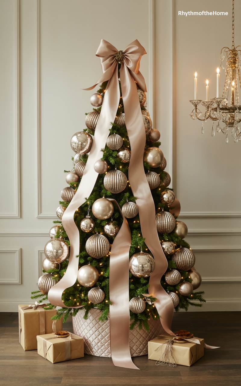 Elegance and glamour define this stunning Christmas tree, decorated in a sophisticated monochrome palette of rose gold and champagne. The tree is laden with a multitude of large, shimmering baubles in both matte and shiny finishes, creating a luxurious and textured look. A very wide, silky ribbon in a soft, dusty pink hue is expertly woven through the branches, culminating in a magnificent bow at the very top. The warm glow of the lights reflects beautifully off the metallic ornaments, creating a breathtaking display of modern, high-fashion holiday style.