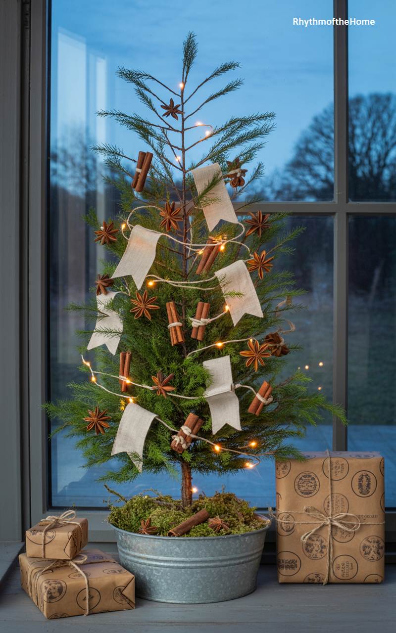 This charming tabletop Christmas tree is a celebration of natural, rustic, and wonderfully fragrant holiday decorations. Sitting in a simple galvanized metal pot, the small evergreen is adorned with homemade-style ornaments. Bundles of cinnamon sticks and whole star anise are tied to the branches, promising a delightful spicy scent. A simple garland made of small linen flags is strung around the tree, adding to its handcrafted appeal. Surrounded by presents wrapped in kraft paper, this tree is a perfect example of simple, heartfelt, and multi-sensory Christmas decorating.