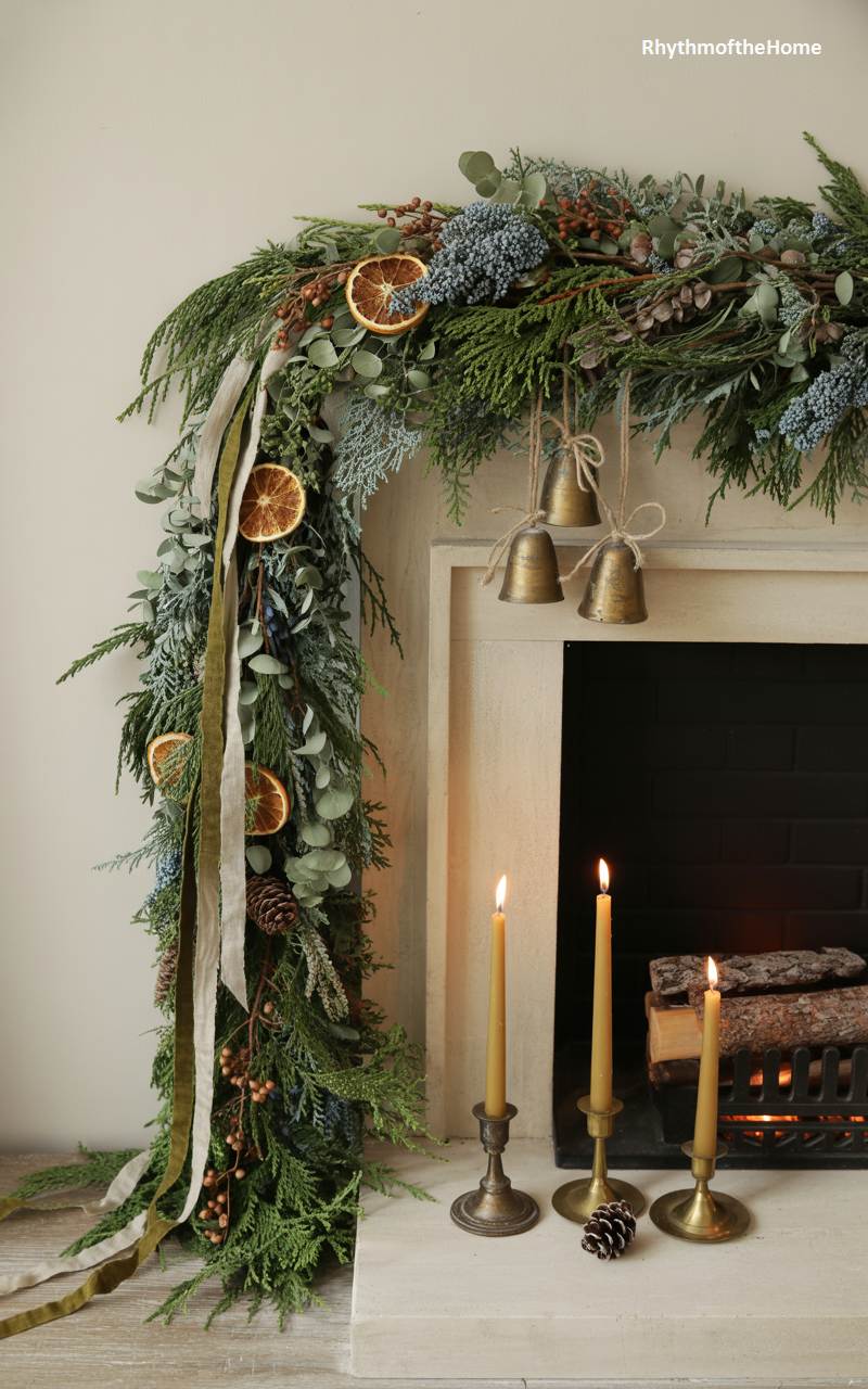 This beautifully styled fireplace mantel showcases a lush and natural approach to Christmas decorating. A thick, asymmetrical garland made of various types of cedar and eucalyptus creates a wonderfully textured and organic look. It’s artfully dotted with dried orange slices, pinecones, and clusters of silvery-blue berries. A long, two-toned ribbon in cream and olive green trails gracefully down one side. A trio of brass bells hangs from the center, adding a touch of rustic charm, while tall, beeswax-colored candles in simple holders provide a warm, flickering light, completing this serene and elegant holiday scene.