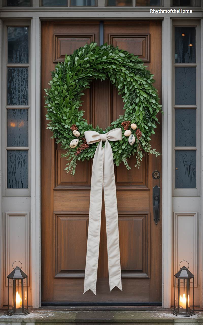 This elegant front door offers a classic and timeless welcome for the Christmas season. The rich, dark wood of the door provides the perfect backdrop for a lush and perfectly round boxwood wreath. The wreath is simply but beautifully adorned with small clusters of red berries and a few delicate, speckled eggs, adding a touch of nature-inspired detail. A large, impeccably tied bow made from a wide, cream-colored satin ribbon hangs from the wreath, its long tails adding a sense of grace and formality. Twin lanterns with glowing candles on either side of the stoop complete this picture of sophisticated holiday charm.