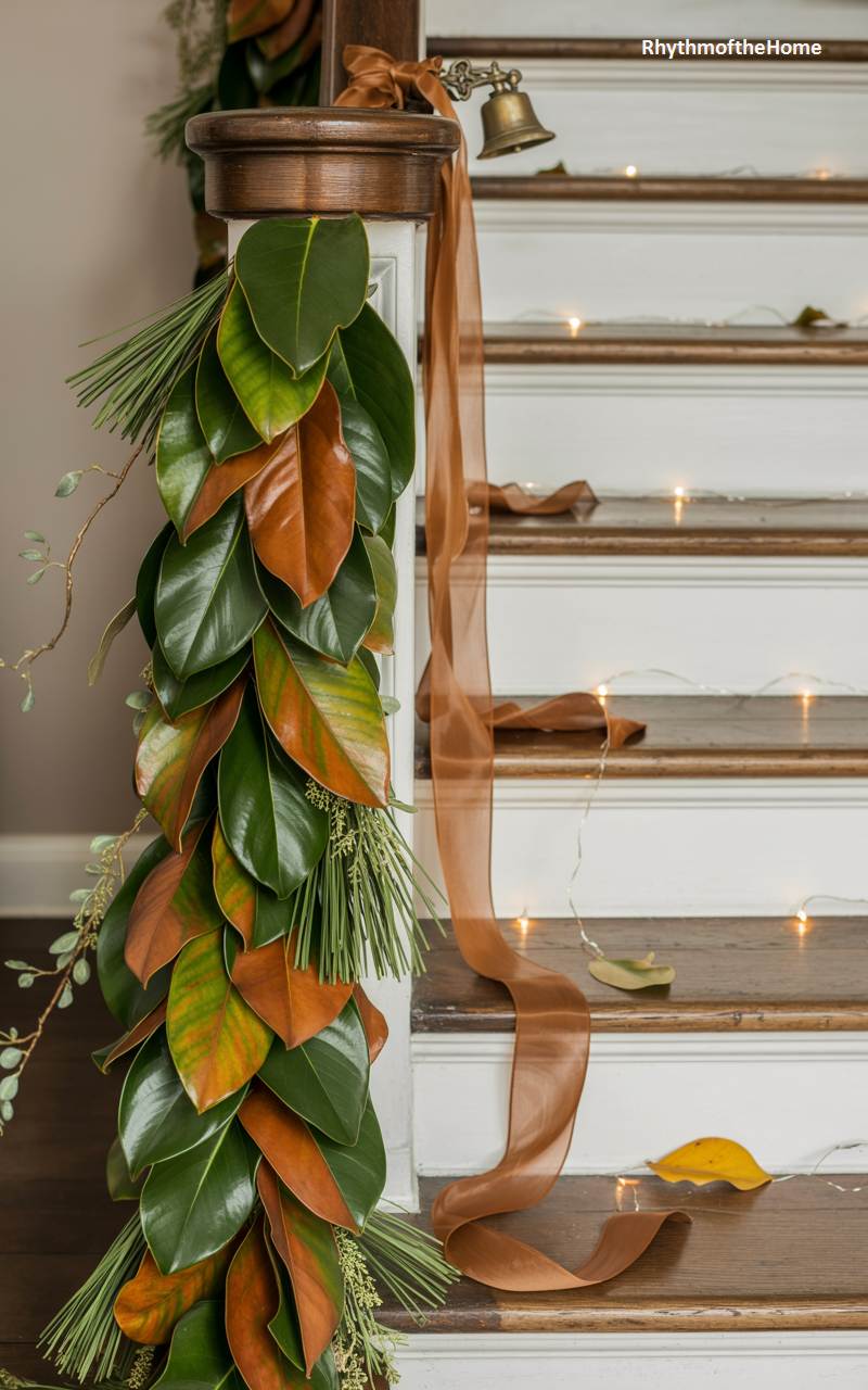 This staircase decoration beautifully captures the essence of a warm and elegant Southern Christmas. Instead of traditional pine, a stunning garland crafted from glossy magnolia leaves cascades down the newel post and railing. The leaves’ dual tones of deep green and velvety copper-brown create a rich and luxurious effect. The garland is accented with sprigs of delicate greenery, and a sheer, coppery-brown ribbon is woven alongside it, catching the light from a string of delicate fairy lights. This is a uniquely beautiful and sophisticated take on holiday greenery, full of regional charm.