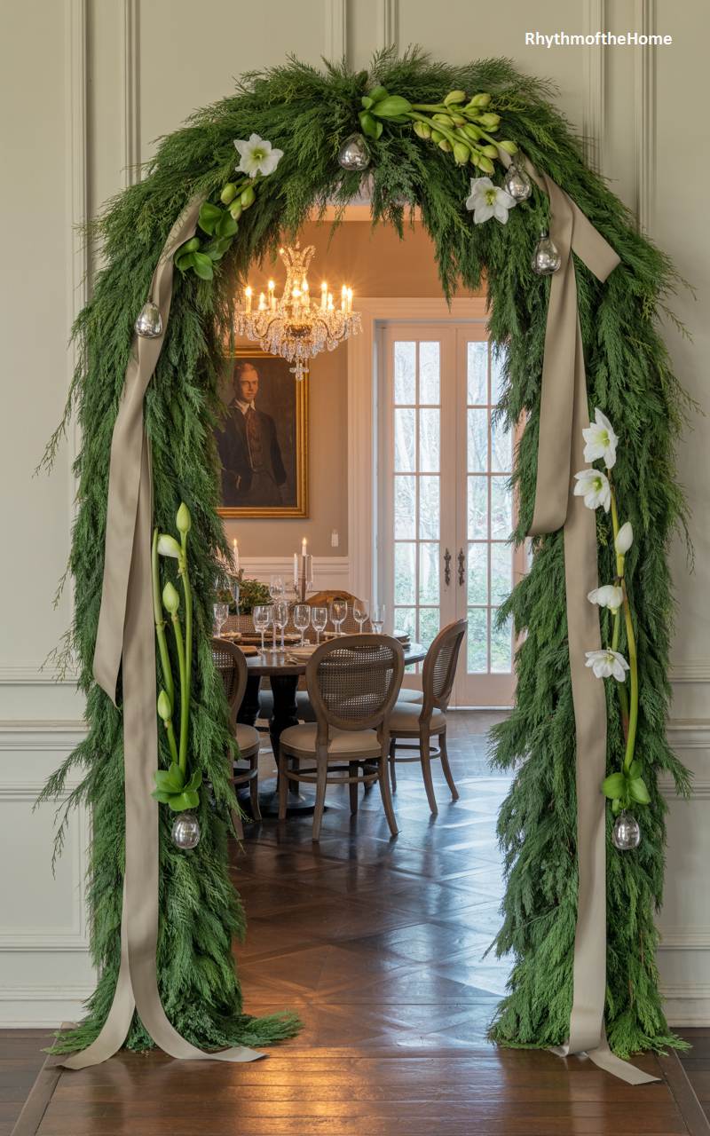 This spectacular archway, lavishly decorated for Christmas, creates a grand and dramatic entrance to the dining room. The entire frame is covered in a dense, lush garland of deep green cedar boughs, creating a feeling of walking through a festive forest. The garland is elegantly adorned with sprays of fresh white amaryllis flowers, shimmering silver ball ornaments, and long, graceful ribbons in a sophisticated champagne color. Through the arch, a beautifully set dining table and a sparkling chandelier are visible, promising a magnificent holiday celebration within. This is holiday decorating on a truly breathtaking scale.