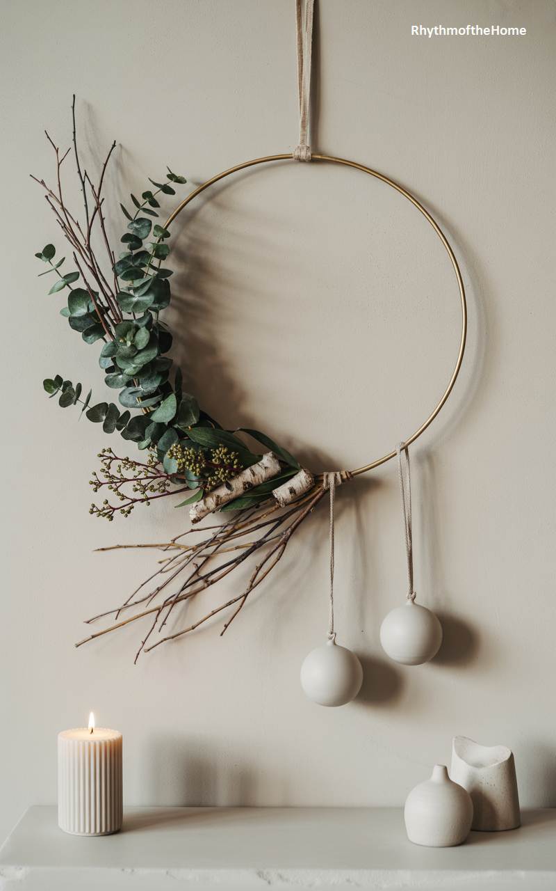 This contemporary wreath is a perfect example of minimalist holiday elegance. It features a simple, slender brass hoop as its base, which is asymmetrically adorned with a beautiful arrangement of fresh eucalyptus, delicate seed pods, and a few small pieces of birch bark. The combination of the cool metal, the soft green leaves, and the rustic textures creates a look that is both modern and organic. Hanging from the hoop are two simple, matte white ornaments on long strings. A single fluted candle sits below, its warm flame creating a peaceful and serene atmosphere.