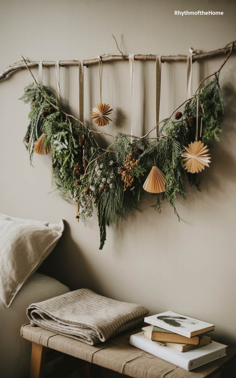 This beautiful wall hanging is a charming and creative alternative to a traditional Christmas wreath, embodying a rustic Scandinavian aesthetic. A natural, weathered branch serves as the base, from which hang various lengths of ribbon. A lush, asymmetrical swag of mixed evergreens, pinecones, and dried botanicals is attached to the branch. Interspersed among the greenery are delicate, handcrafted paper star ornaments. The overall effect is natural, textural, and full of homespun charm, creating a warm and artistic holiday focal point above a cozy bench.