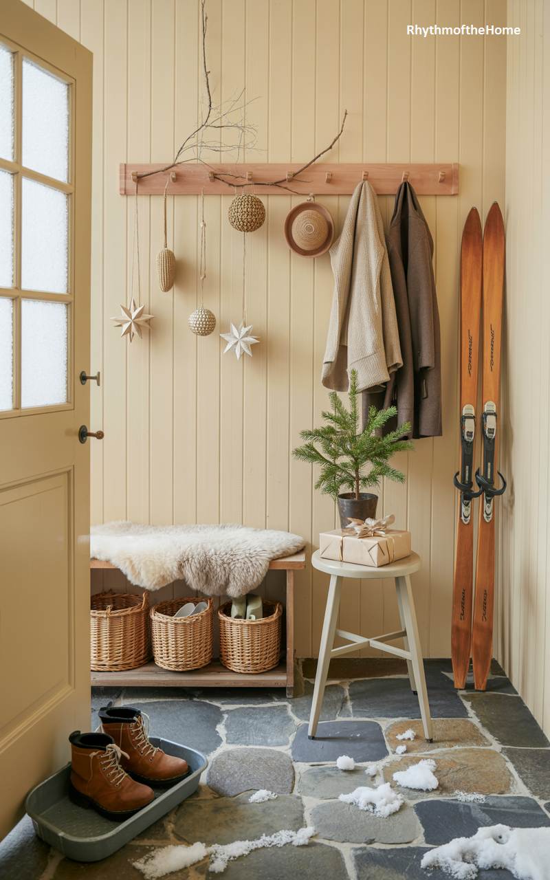 This cozy and practical mudroom is filled with the simple, heartfelt charm of a Scandinavian Christmas. The warm, butter-yellow paneled walls create a cheerful and inviting atmosphere, perfect for shaking off the winter chill. A natural branch serves as a rustic coat rack, from which hang charming straw stars and woven ornaments. A pair of vintage wooden skis leans in the corner, hinting at winter adventures. A small fir tree sits atop a simple stool, its present wrapped in brown paper and twine, while a sheepskin throw on the bench adds a layer of quintessential Nordic hygge.