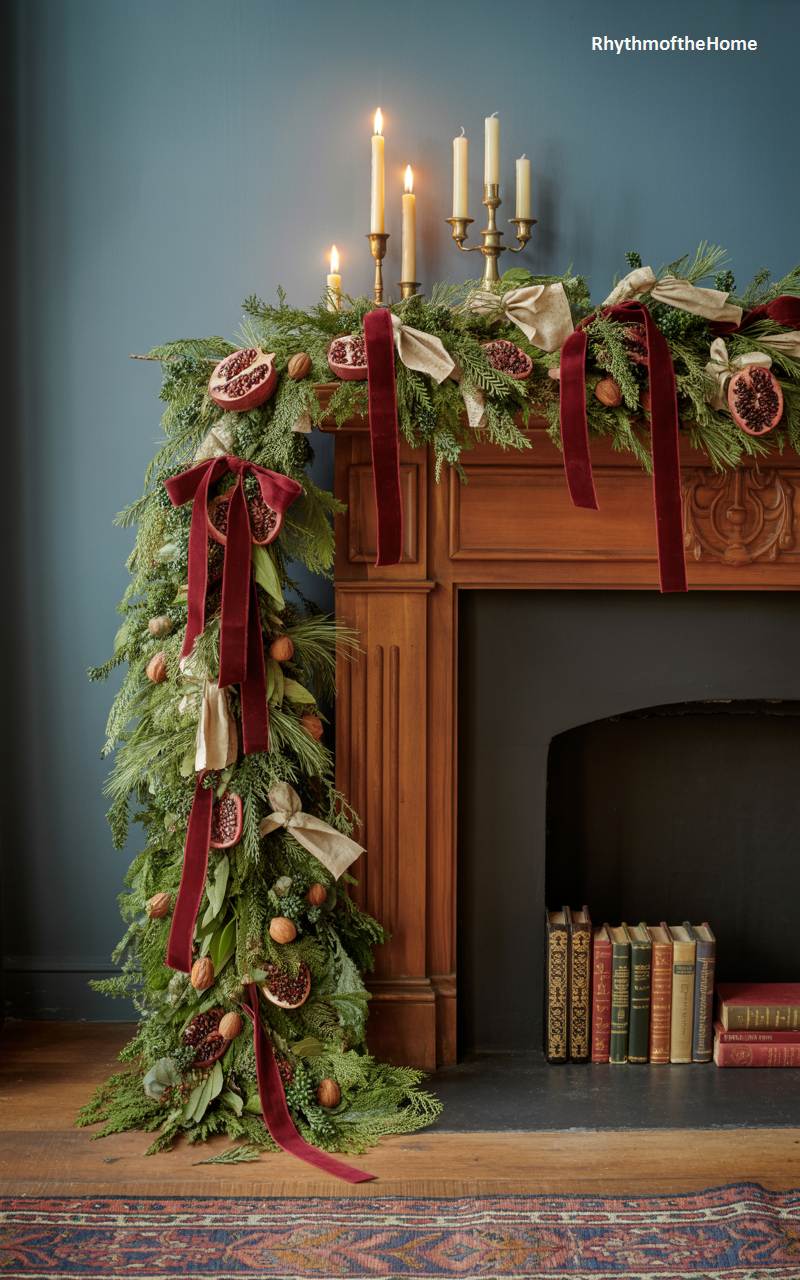 This magnificent and opulent fireplace garland harks back to the rich, decorative traditions of the Victorian era. A thick, lush base of evergreen boughs cascades dramatically down one side of the intricately carved wooden mantelpiece. The garland is lavishly adorned with rich, red velvet ribbons tied into beautiful bows, along with halved pomegranates and whole walnuts, symbolizing abundance and hospitality. The deep red and green color scheme is classic and festive, creating a look of timeless elegance and holiday grandeur that is both dramatic and inviting.