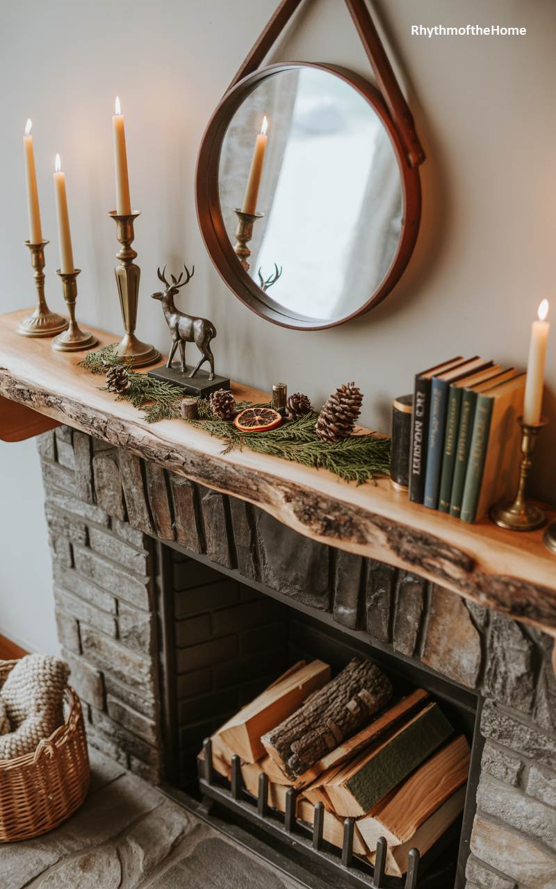 This fireplace mantel perfectly balances rustic charm with modern simplicity for a cozy and stylish Christmas display. The mantel itself is a thick, live-edge wood slab, its natural, organic shape providing a beautiful contrast to the stacked stone of the fireplace. The decorations are spare but effective: a simple garland of fresh pine needles, a few scattered pinecones, and a slice of dried orange. A small, elegant reindeer figurine and a row of classic brass candlesticks add a touch of traditional warmth, their glow reflected in the round mirror hanging above. This is a perfect example of understated and authentic holiday style.