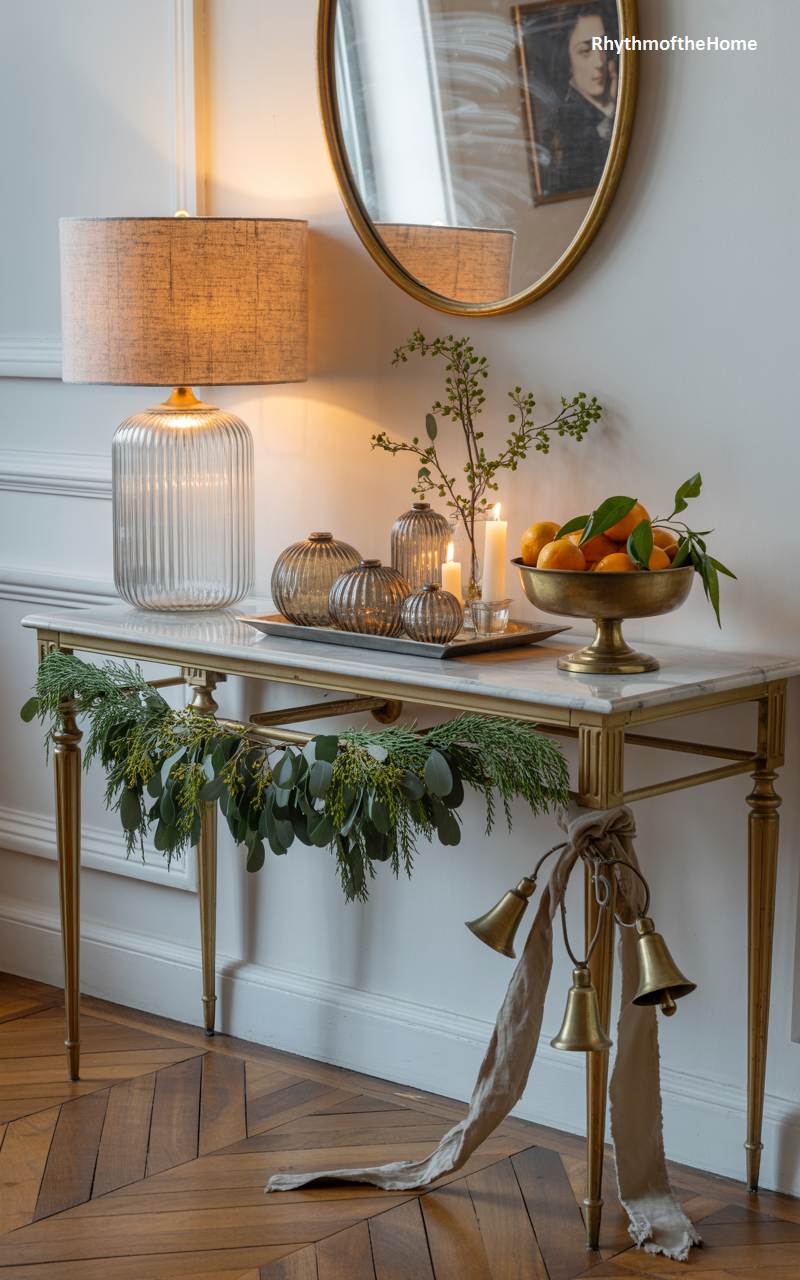 This elegant console table is styled for a sophisticated and glamorous Christmas. The slender, gilded metal frame and marble top provide a luxurious base for the festive arrangement. A simple garland of cedar and eucalyptus is draped asymmetrically across the front, tied at one end with a rustic linen ribbon and a cluster of large brass bells. On the tabletop, a collection of mercury glass vases and candle holders shimmers in the warm light of a classic table lamp and flickering candles. A brass bowl filled with fresh clementines adds a touch of natural color and completes this chic and festive vignette.