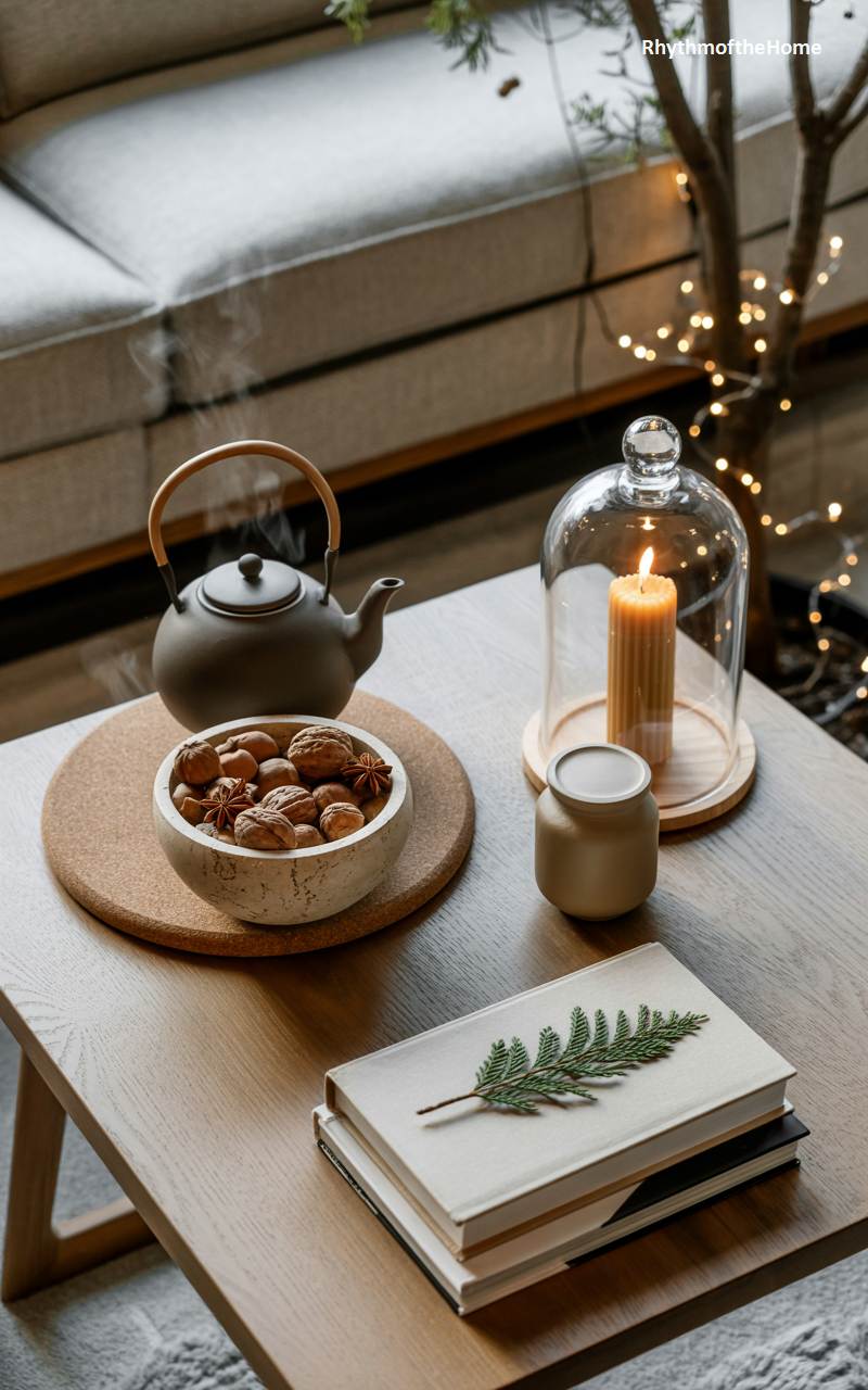 This serene tabletop scene captures a moment of quiet contemplation amidst the holiday season, blending Zen principles with festive warmth. A rustic wooden coffee table holds a simple, elegant arrangement. Steam rises gently from a minimalist grey teapot, ready to be poured. A bowl of walnuts and star anise sits on a cork trivet, adding a natural, textural element. A single beeswax candle glows warmly from within a glass cloche, its contained light creating a focal point of peace and tranquility. A simple cedar sprig resting on a stack of books adds the final, subtle touch of Christmas.