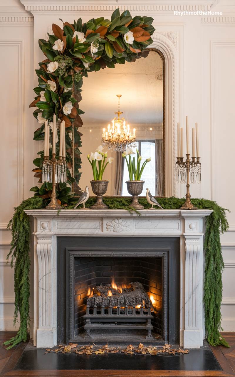 This fireplace is a masterpiece of grand, southern-inspired Christmas decor. A magnificent arched mirror is framed by an even more magnificent asymmetrical garland of glossy magnolia leaves and fresh white magnolia blossoms, creating a breathtaking floral display. The white marble mantelpiece is adorned with a lush evergreen garland, upon which stand two elegant silver candelabras and a pair of charming ceramic birds. A fire roars in the hearth below, casting a warm and inviting glow on this stunningly beautiful and opulent scene that is the epitome of classic, formal holiday elegance.