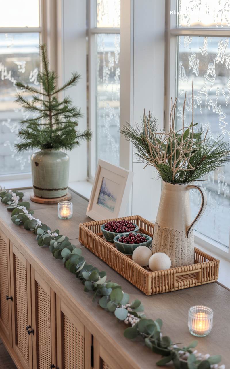This beautifully styled sideboard captures the light and airy feel of a coastal Christmas. The woven cane doors of the wooden cabinet add a touch of natural texture. On top, a simple garland of eucalyptus and white berries is draped artfully along its length. A small evergreen tree in a rustic green ceramic pot adds a traditional holiday touch. A collection of small bowls filled with vibrant red cranberries sits in a wicker tray, providing a beautiful pop of festive color. The frosted winter light from the window behind illuminates the scene, creating a peaceful and serene holiday vignette.