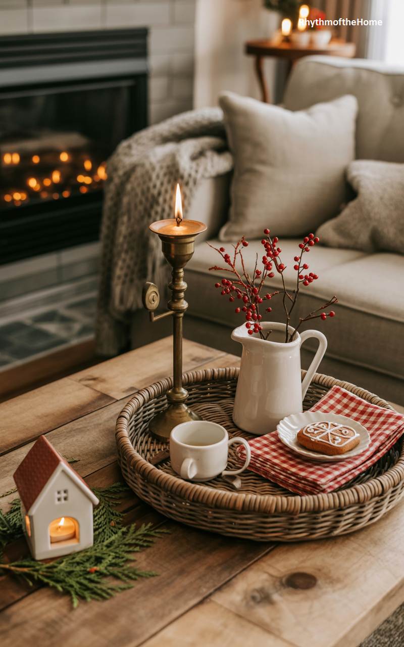 This inviting coffee table vignette is the essence of cozy Christmas comfort. A woven wicker tray corrals a collection of heartwarming holiday items. A single lit candle in an antique-style brass holder casts a warm, flickering light. A small white ceramic house, with a tealight glowing from within, adds a touch of whimsical charm. A simple white pitcher holds branches of festive red winterberries, and a delicious-looking gingerbread cookie sits on a plate with a red and white checkered napkin, ready to be enjoyed with a cup of tea. This scene is a perfect invitation to slow down and savor the simple pleasures of the season.