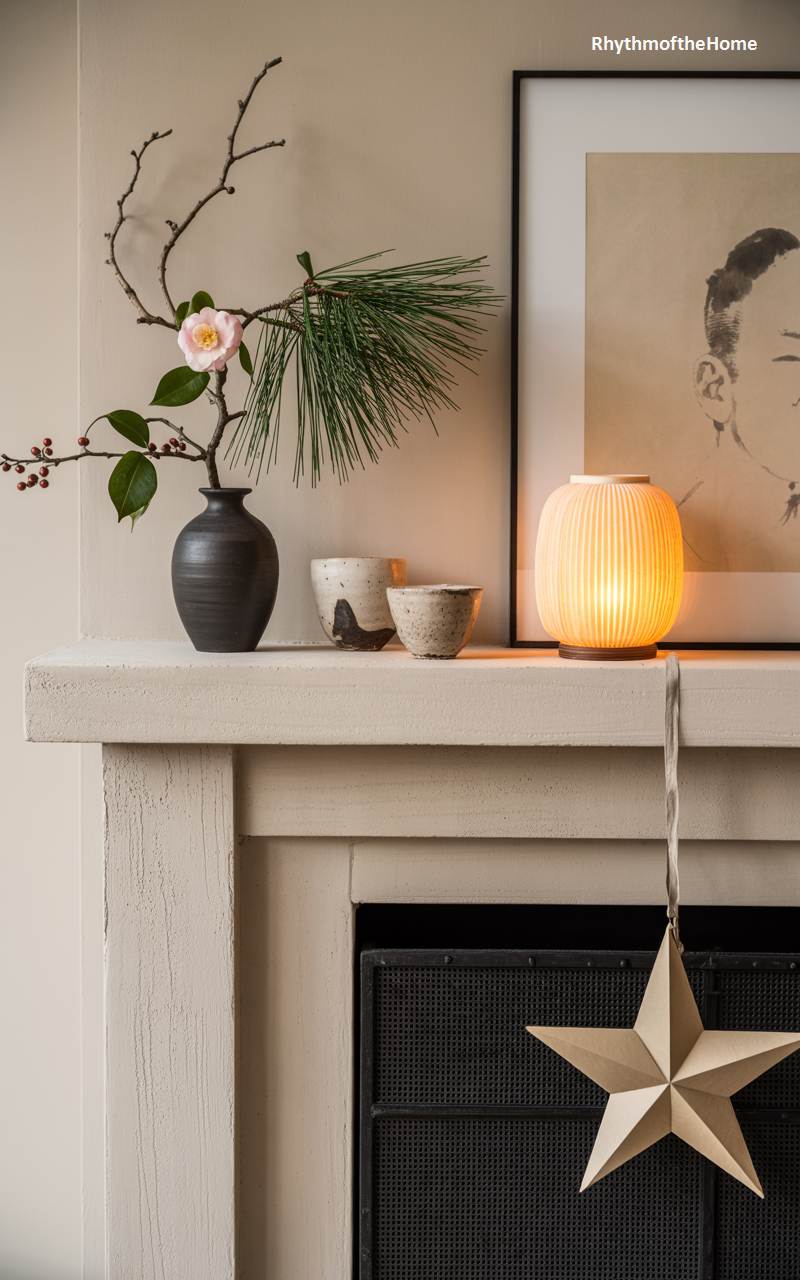 This mantelpiece display is a work of art, blending the Japanese art of flower arranging, ikebana, with a minimalist Christmas aesthetic. A single, elegant branch of camellia with a delicate pink blossom and pine needles is arranged in a dark, sculptural vase. Two rustic, wabi-sabi style tea cups sit beside it. A modern, fluted paper lantern casts a soft, warm glow, highlighting a framed ink-wash portrait. A single, large paper star hangs from the mantel, adding a simple yet significant touch of holiday symbolism. The entire composition is one of balance, tranquility, and understated beauty.