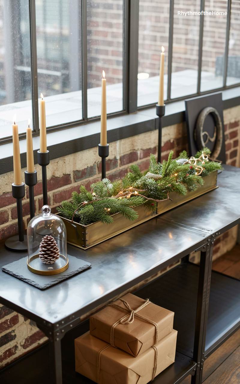 This console table vignette perfectly marries a cool, industrial aesthetic with the warmth of Christmas. The dark metal table stands before a large window and an exposed brick wall, setting a stylish urban scene. A long, rectangular brass planter is filled with fresh pine boughs and warm fairy lights, creating a festive and glowing centerpiece. A large pinecone is displayed under a glass cloche, elevating a simple natural object into a piece of art. A row of tall, slender taper candles in modern black holders adds height and a touch of elegant drama, while gifts wrapped in brown paper wait below.