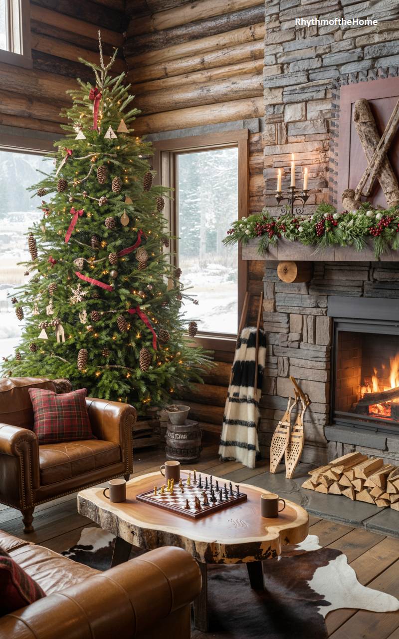 This living room is the quintessential log cabin Christmas dream. A magnificent, tall Christmas tree is adorned with natural decorations like pinecones and rustic ornaments, accented with a simple red ribbon. The grand, stacked-stone fireplace has a roaring fire, its mantel decorated with a lush garland and candles. A pair of vintage snowshoes leans against the hearth, while a cozy plaid and wool blanket is draped over a ladder. A leather armchair and a live-edge wood coffee table set with a chessboard create the perfect spot to relax and enjoy the warm, rustic, and incredibly cozy holiday atmosphere.