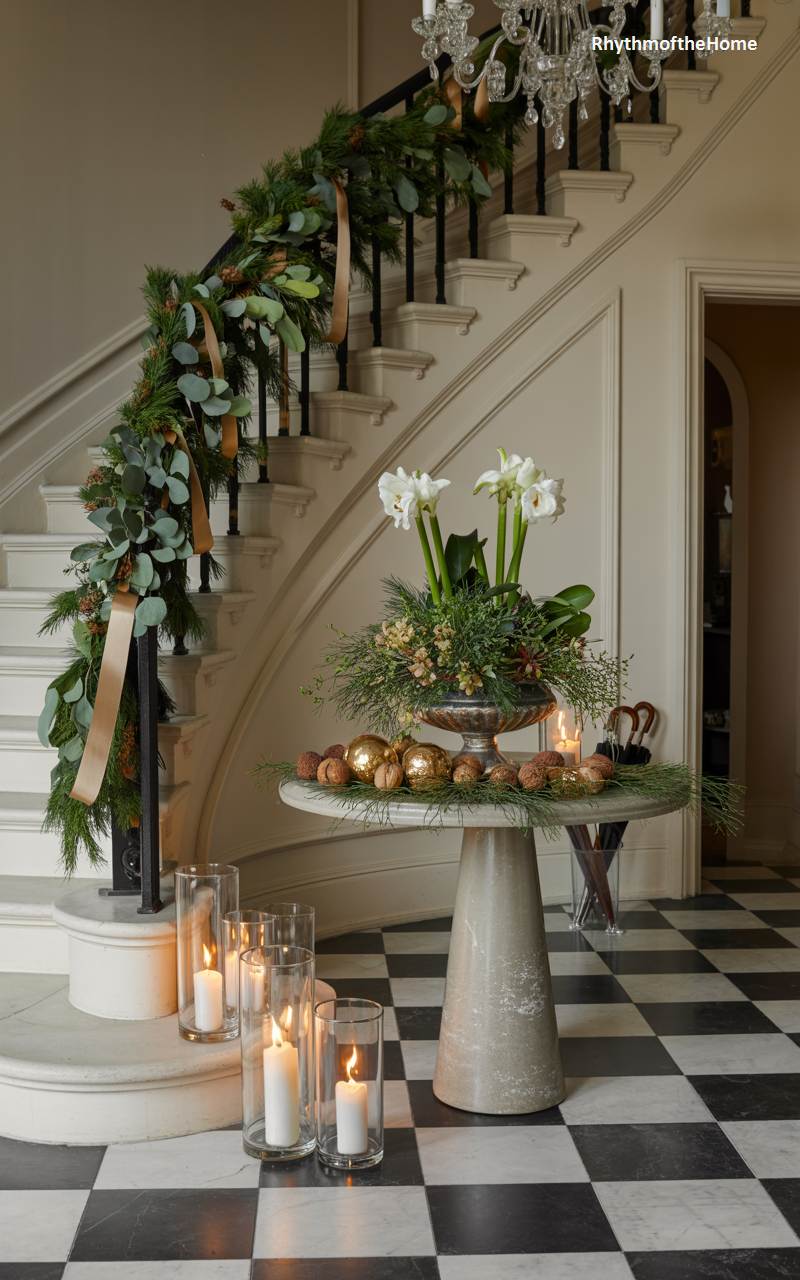 Elegance and tradition converge in this stately foyer, where Christmas is celebrated on a grand scale. A lush and voluminous garland of mixed evergreens, eucalyptus, and pinecones gracefully descends the sweeping staircase railing, interwoven with a wide, satin ribbon in a sophisticated old gold hue. At the base of the stairs, a classic pedestal table showcases a magnificent floral arrangement of white amaryllis and fresh greenery, surrounded by golden ornaments. A grouping of pillar candles in glass hurricanes on the marble floor casts a warm, flickering light, creating a truly breathtaking and festive welcome for holiday guests.