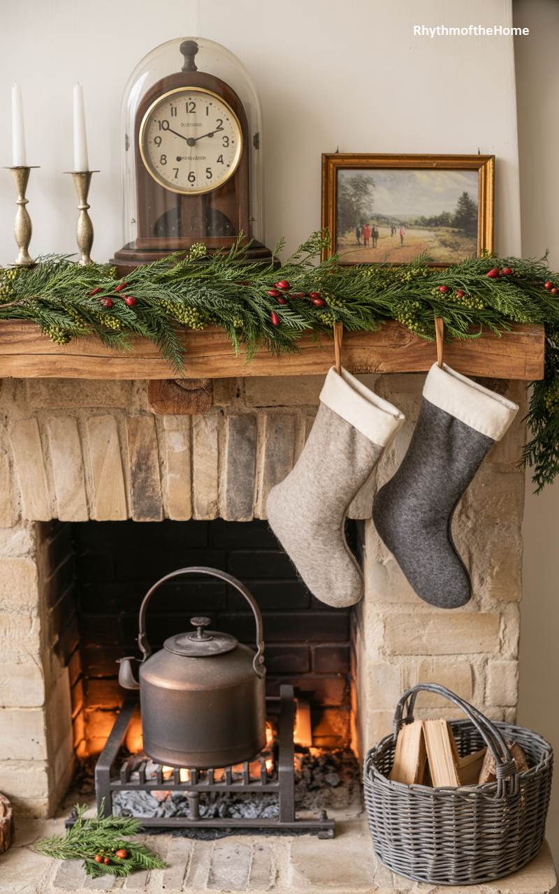 This charming brick fireplace exudes the cozy, timeless appeal of an English country Christmas. The rustic wooden beam mantel is draped with a simple but beautiful garland of cedar, dotted with clusters of red and green berries. A classic mantel clock is flanked by a pair of simple white taper candles. Two lovely, neutral-toned felt stockings hang from the mantel, ready for Father Christmas. In the hearth, a vintage black kettle sits over the glowing embers of a fire, suggesting warmth and hospitality. This scene is a heartwarming picture of simple, traditional holiday comfort.
