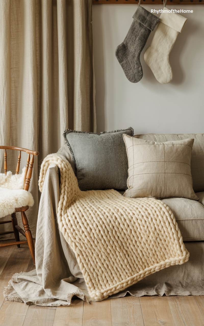 This serene living room corner embodies the cozy and minimalist principles of Scandinavian design. A comfortable, linen-upholstered sofa is layered with soft textures, including a chunky knit wool throw and simple, neutral-toned pillows. Two felted wool Christmas stockings, one grey and one cream, hang simply from a peg rail on the wall. A vintage wooden chair with a sheepskin throw adds another layer of warmth and rustic charm. The overall color palette is calm and muted, creating a peaceful and inviting space to relax and enjoy the quiet moments of the holiday season.