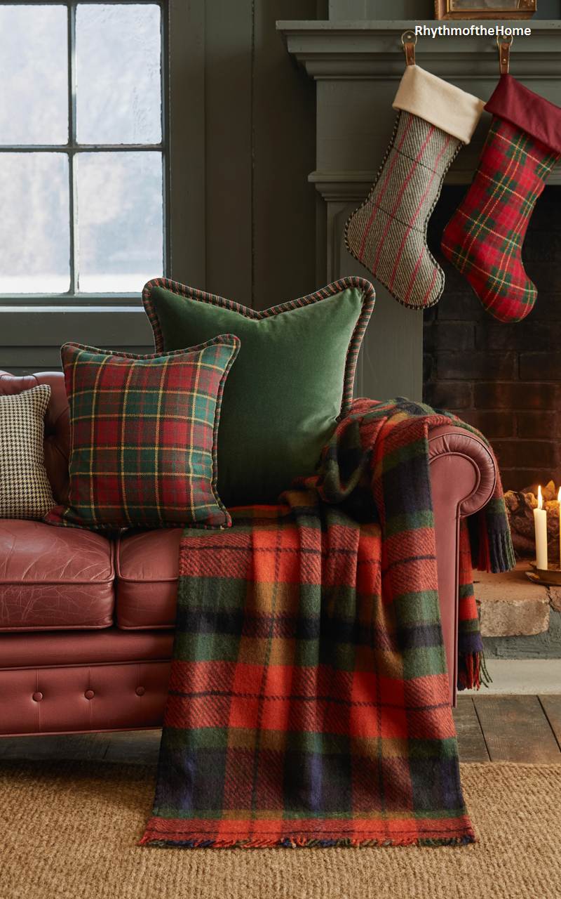 This cozy scene is steeped in the rich traditions of a Scottish Christmas. A classic leather sofa is made even more inviting with the addition of a luxurious, deep green velvet pillow and several cushions and a throw blanket in a festive tartan plaid. The warm reds, greens, and blues of the plaid are quintessential holiday colors, evoking a sense of heritage and warmth. In the background, a fire crackles in the hearth, with traditional Christmas stockings hanging from the mantel. The combination of rich textures and classic patterns creates a perfectly cozy and nostalgic atmosphere for a Christmas celebration.