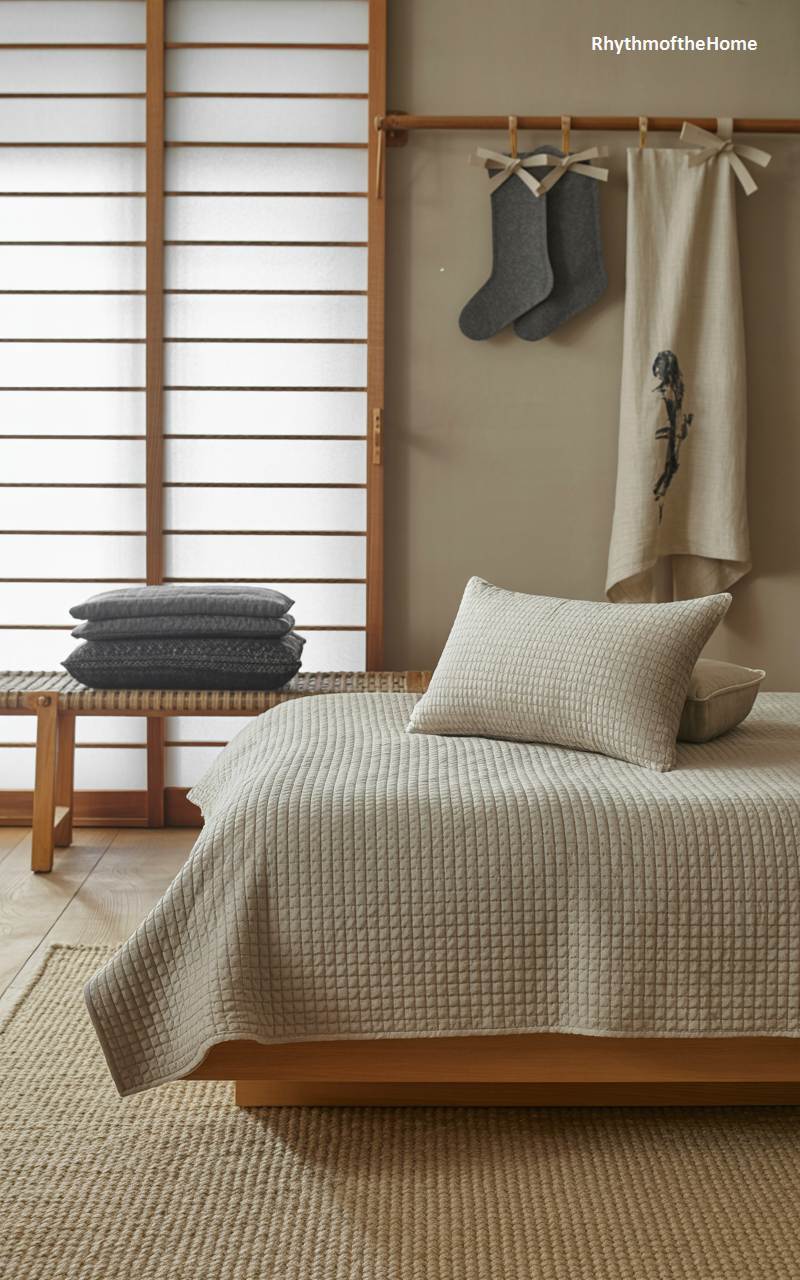 This bedroom is a tranquil oasis of minimalist design, with subtle touches that acknowledge the Christmas season in a peaceful, Japanese-inspired way. The low platform bed is dressed in a simple, quilted coverlet. A wooden rod behind the bed holds two simple grey felt stockings and a beautifully printed linen tea towel. A woven bench at the foot of the bed holds a stack of dark grey cushions. The space is defined by clean lines, natural materials like wood and jute, and a calm, uncluttered aesthetic, creating a restful retreat for the holidays.