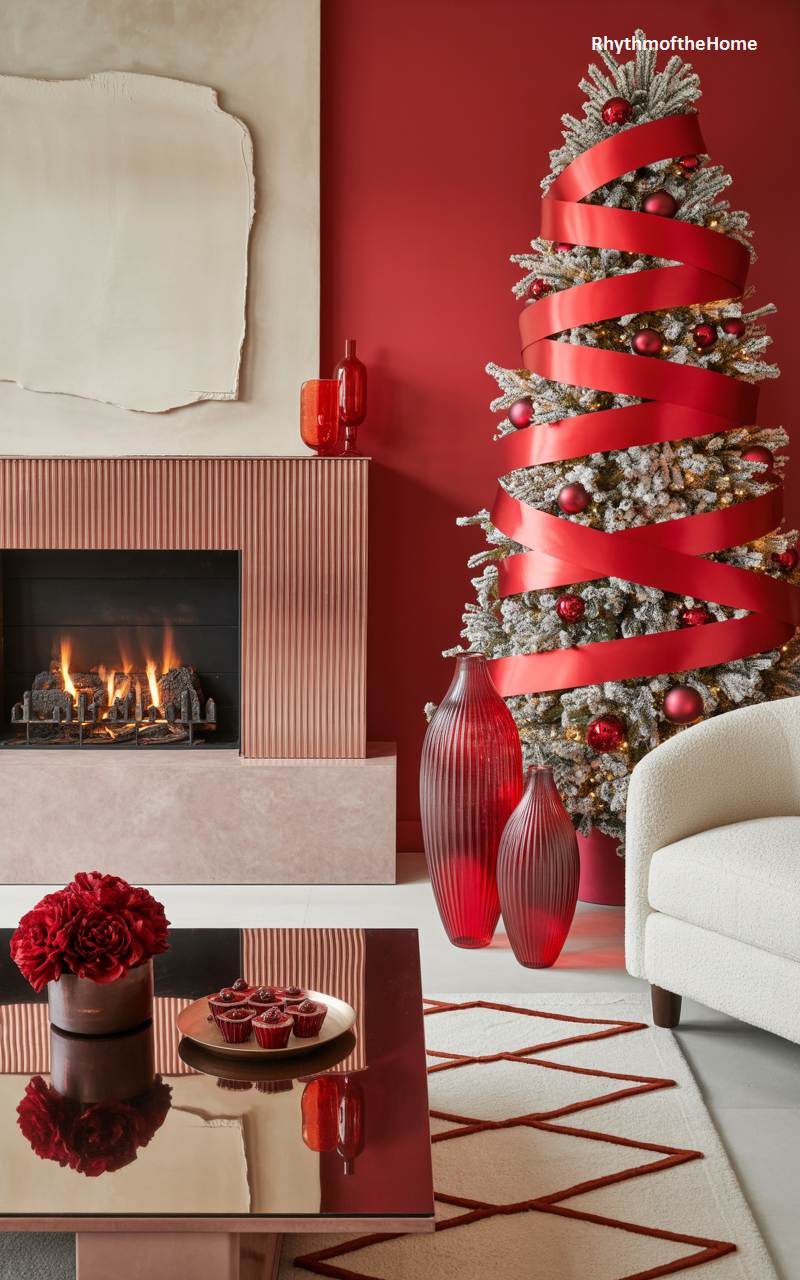 This elegant Christmas-themed room exudes warmth and sophistication through its cohesive red palette. A beautifully flocked Christmas tree stands adorned with bold red ornaments and a striking wide red ribbon spiraling around it. The cozy fireplace, framed in textured pinkish-red tiles, casts a soft glow that complements the deep red walls. Sleek red glass vases and a reflective coffee table topped with red roses and cupcakes add festive charm. A plush white armchair and a cream rug with red geometric lines balance the intensity of the décor, creating a luxurious yet inviting holiday atmosphere.