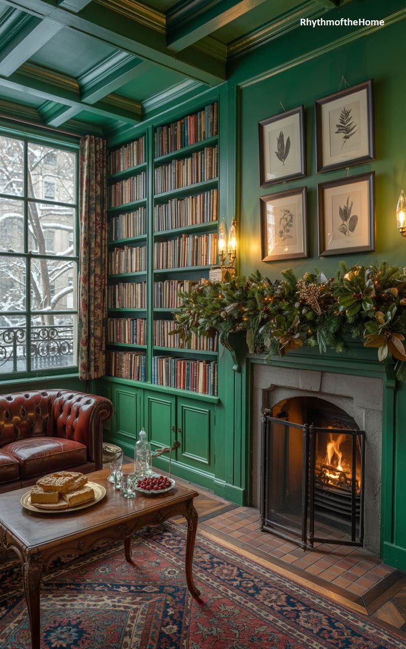 This magnificent library, with its floor-to-ceiling bookshelves and paneling painted a deep, dramatic green, is the ultimate cozy Christmas escape. A roaring fire in the stone fireplace provides warmth and a cheerful glow, its mantelpiece adorned with a lush, festive garland. A comfortable, well-worn leather Chesterfield sofa invites you to curl up with a good book and a plate of shortbread from the coffee table. The snowy view from the large window adds to the feeling of being in a warm, scholarly sanctuary, tucked away from the winter cold. This room is a perfect blend of grandeur and comfort.