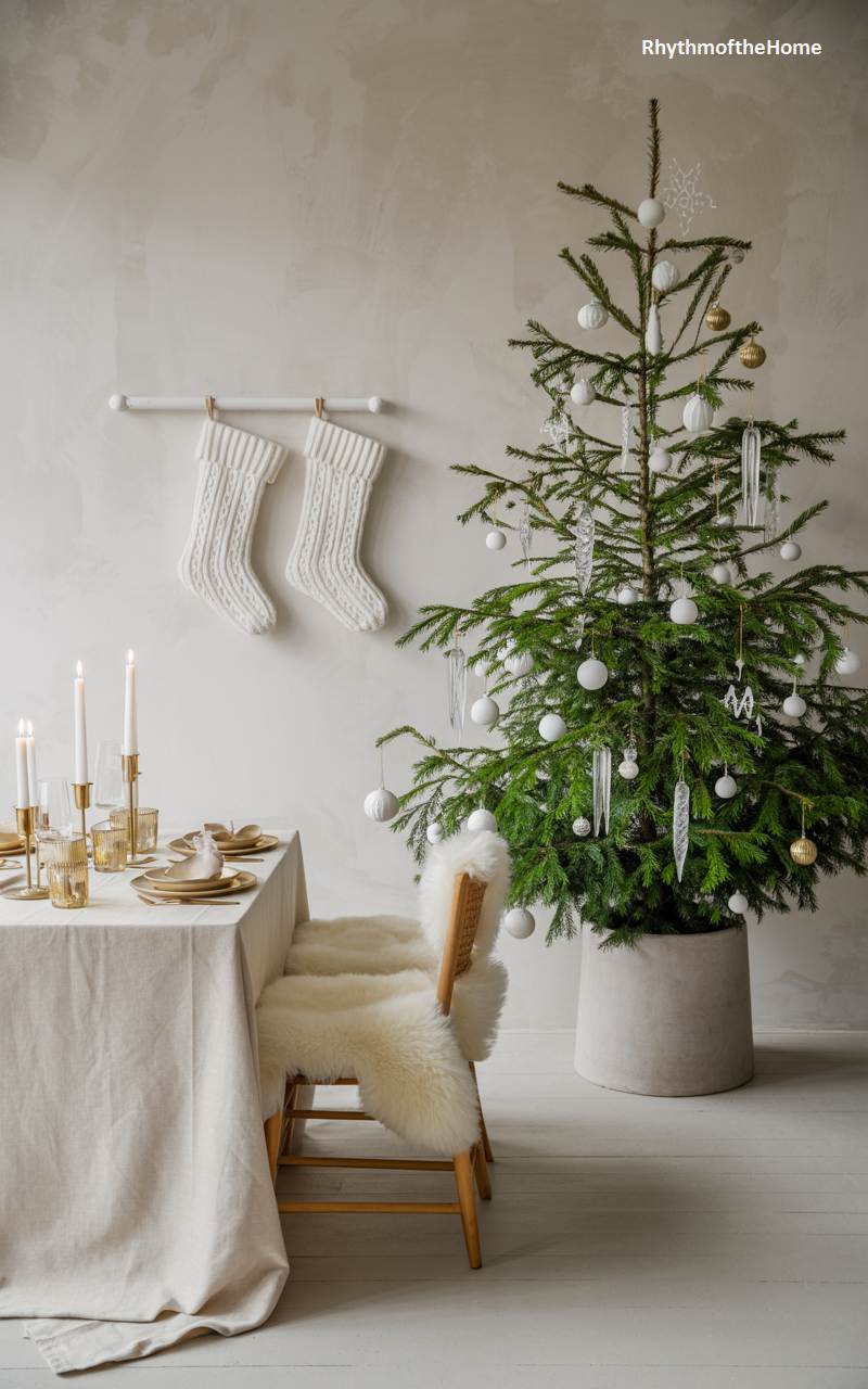 This dining scene is a beautiful expression of Scandinavian Christmas style, with a clean, bright, and minimalist aesthetic. A simple dining table is dressed in a natural linen cloth, set with elegant gold and white tableware. A tall, sparsely branched Christmas tree is decorated in a simple palette of white and gold, with delicate baubles and icicle ornaments. Two white, cable-knit stockings hang from a simple peg rail on the wall. A wooden chair draped with a fluffy white sheepskin throw adds a crucial touch of “hygge” warmth and texture to the serene, light-filled space.