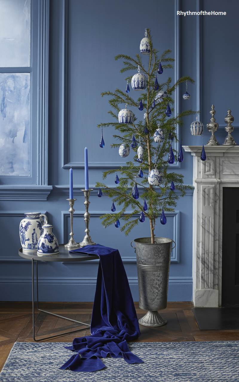 This striking holiday vignette is a sophisticated and unconventional celebration of Christmas color. Against a backdrop of rich, royal blue paneled walls, a slender evergreen tree is decorated exclusively with blue and white chinoiserie-style ornaments and deep blue glass teardrops. A collection of blue and white porcelain ginger jars sits on a small table nearby, alongside two bold blue candles in silver holders. A swath of luxurious blue velvet fabric drapes artfully from the table, adding another layer of rich texture. This is a bold, elegant, and beautifully coordinated take on holiday decor.