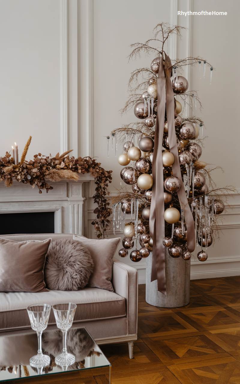 This living room features a highly glamorous and dramatic take on Christmas decor, using a sophisticated monochromatic color scheme. A leafless tree is absolutely dripping with an abundance of metallic baubles in shades of champagne, taupe, and bronze. Glistening icicle ornaments and a wide, silky taupe ribbon add to the opulent, over-the-top effect. The fireplace mantel is similarly adorned with dried, textural botanicals in the same color family. The plush, velvet-upholstered sofa and cut-crystal glasses on the mirrored coffee table complete this stunning vision of luxurious and contemporary holiday style.