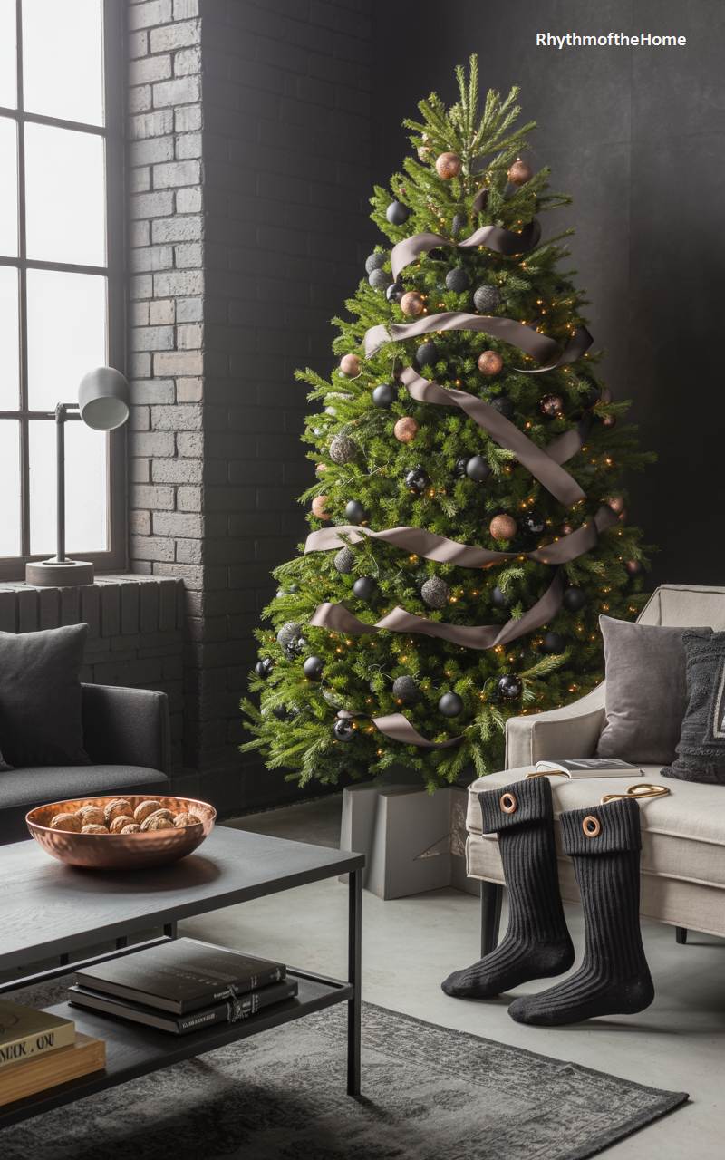 This living room embraces a dark, moody, and modern aesthetic for a sophisticated and cozy Christmas. The black brick wall and large industrial window create a dramatic backdrop for a full, beautifully shaped Christmas tree. The tree is decorated with black, grey, and copper ornaments, and a wide grey ribbon is woven through its branches, creating a look that is both elegant and understated. A comfortable sofa and armchair in neutral tones provide a cozy place to relax, while a bowl of walnuts on the coffee table adds a natural, rustic touch. Two black stockings on the chair add a final, stylish holiday note.