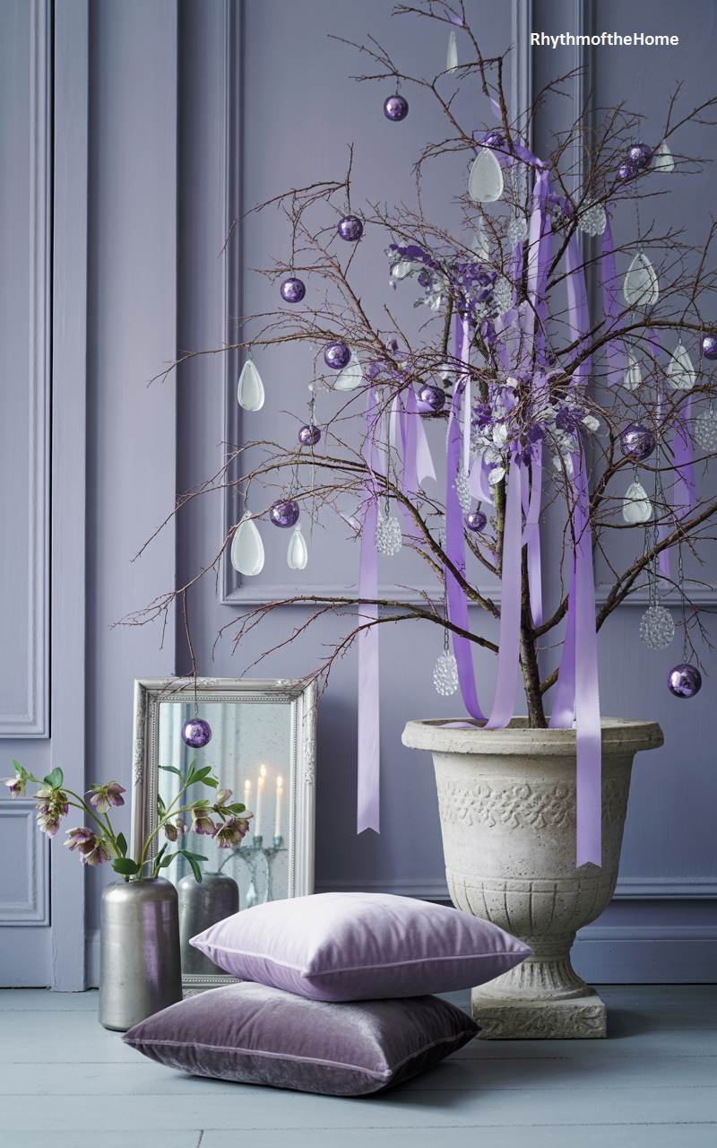 This enchanting scene showcases a unique and dreamy Christmas color palette of lavender and purple. A whimsical, leafless tree stands in a classic white urn, its delicate branches adorned with shimmering purple baubles and translucent, iridescent ornaments. Long, flowing ribbons in various shades of lavender and lilac are tied to the branches, adding softness and movement. A collection of plush velvet pillows in matching purple tones is stacked on the floor, and a small mirror reflects the warm glow of candles. This is a wonderfully creative and romantic take on holiday decorating.