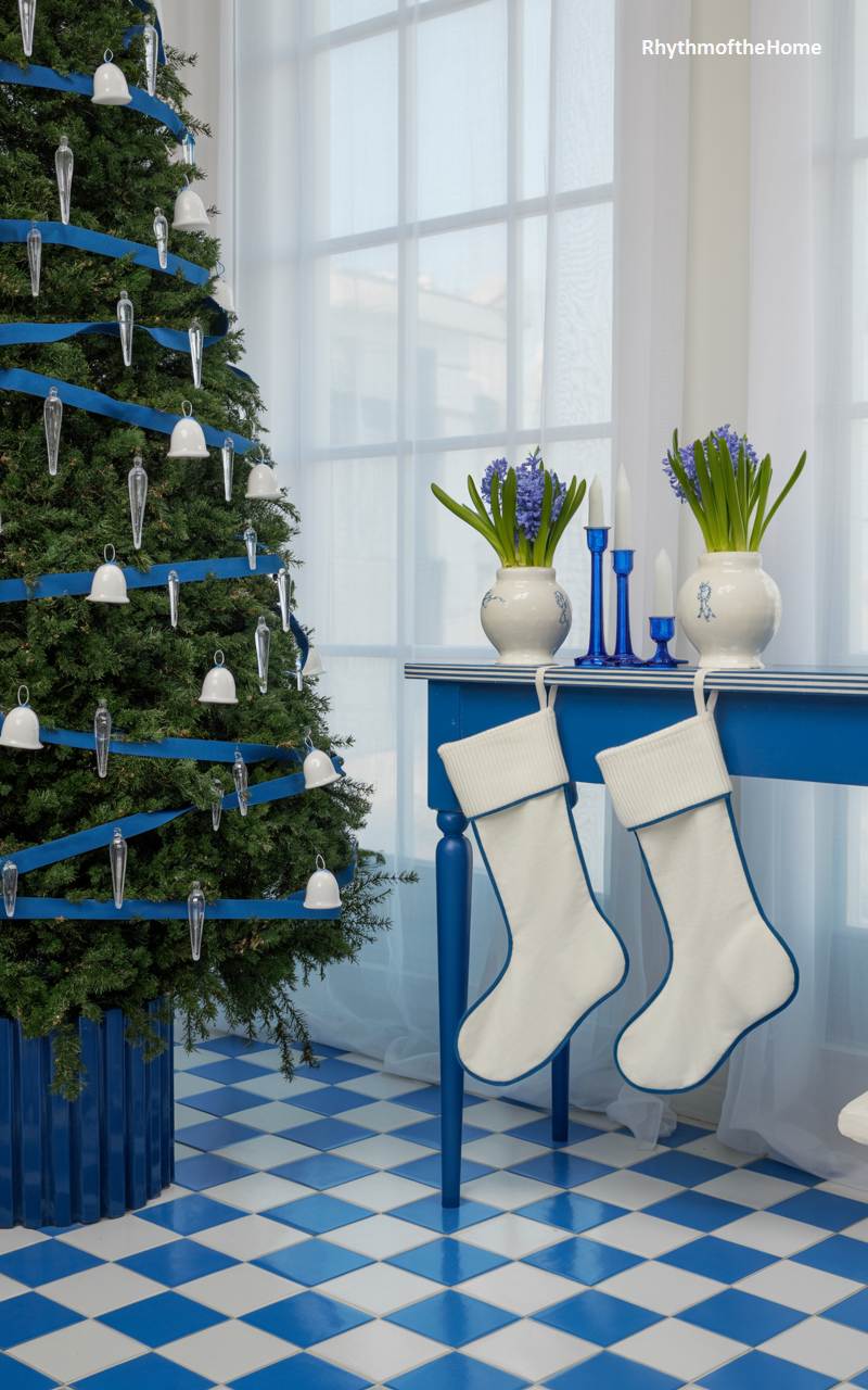 This whimsical Christmas scene is a fantasy in blue and white. A tall Christmas tree is decorated with a cascade of delicate white bells, glass icicles, and a spiraling blue ribbon, creating a crisp and cheerful look. The blue and white checkered floor provides a bold, graphic foundation for the entire room. A blue console table holds a pair of white Christmas stockings, and two vases of blooming blue hyacinths add a touch of fresh, fragrant beauty. This is a highly stylized and imaginative take on holiday decor, full of playful charm and vibrant color.