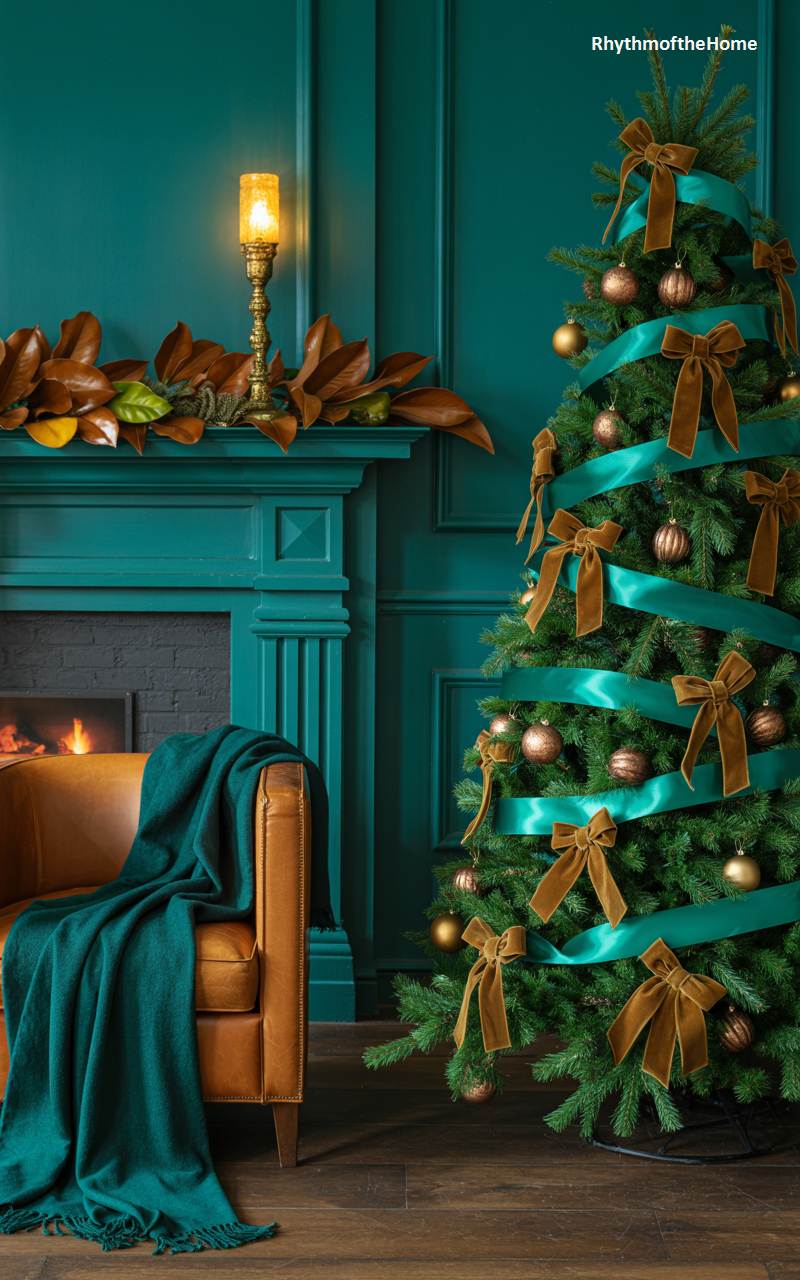 This living room is a luxurious and sophisticated celebration of Christmas, featuring a rich and elegant color palette of deep teal and warm gold. A beautiful Christmas tree is adorned with a stunning teal ribbon that is tied into numerous plush velvet bows, creating a unique and textural garland effect. The ornaments are a simple but elegant mix of gold and bronze baubles. A magnificent magnolia leaf garland drapes across the teal-painted fireplace mantel, and a supple leather chair with a matching teal throw blanket offers a cozy spot to enjoy the roaring fire.