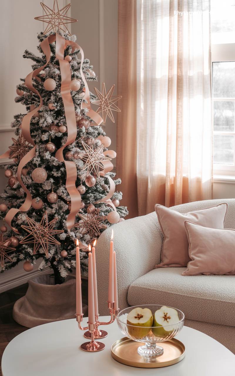 This living room is a vision of soft, romantic Christmas elegance, decorated in a beautiful palette of blush pink, rose gold, and cream. A flocked Christmas tree is adorned with pink and champagne baubles and delicate, geometric star ornaments. A wide, shimmering pink ribbon is woven gracefully through its branches. On the white coffee table, a candelabra with pink taper candles adds a warm, rosy glow, reflected in a bowl of fresh green apples. The comfortable cream-colored bouclé sofa with pink velvet pillows completes this chic, feminine, and wonderfully serene holiday scene.