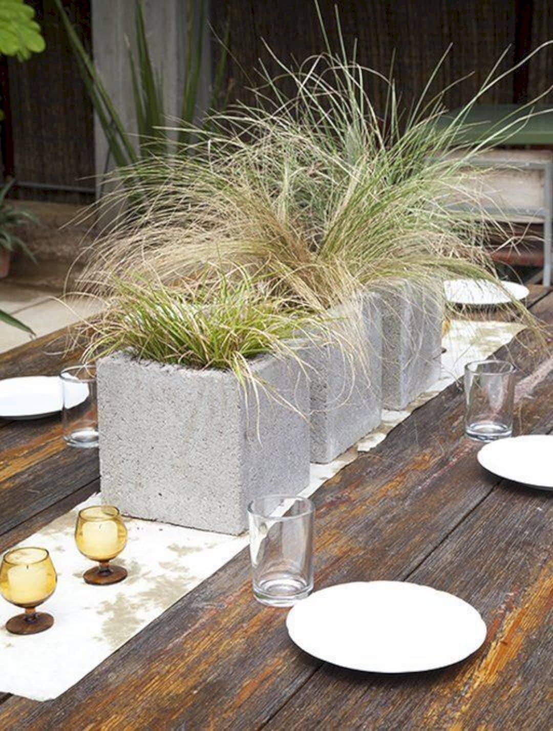 Cinder blocks can work amazingly well for decorative purposes with an industrial vibe. Check out this grassy table centerpiece that’s a simple yet effective aesthetic upgrade for this rustic outdoor dining area. This is simply a solid starting point but you can create your own arrangements using various potted plants. The sturdy design of a cinder block can seem a little harsh for some people but others can appreciate the contrast of wild plants and more calming elements in the background.