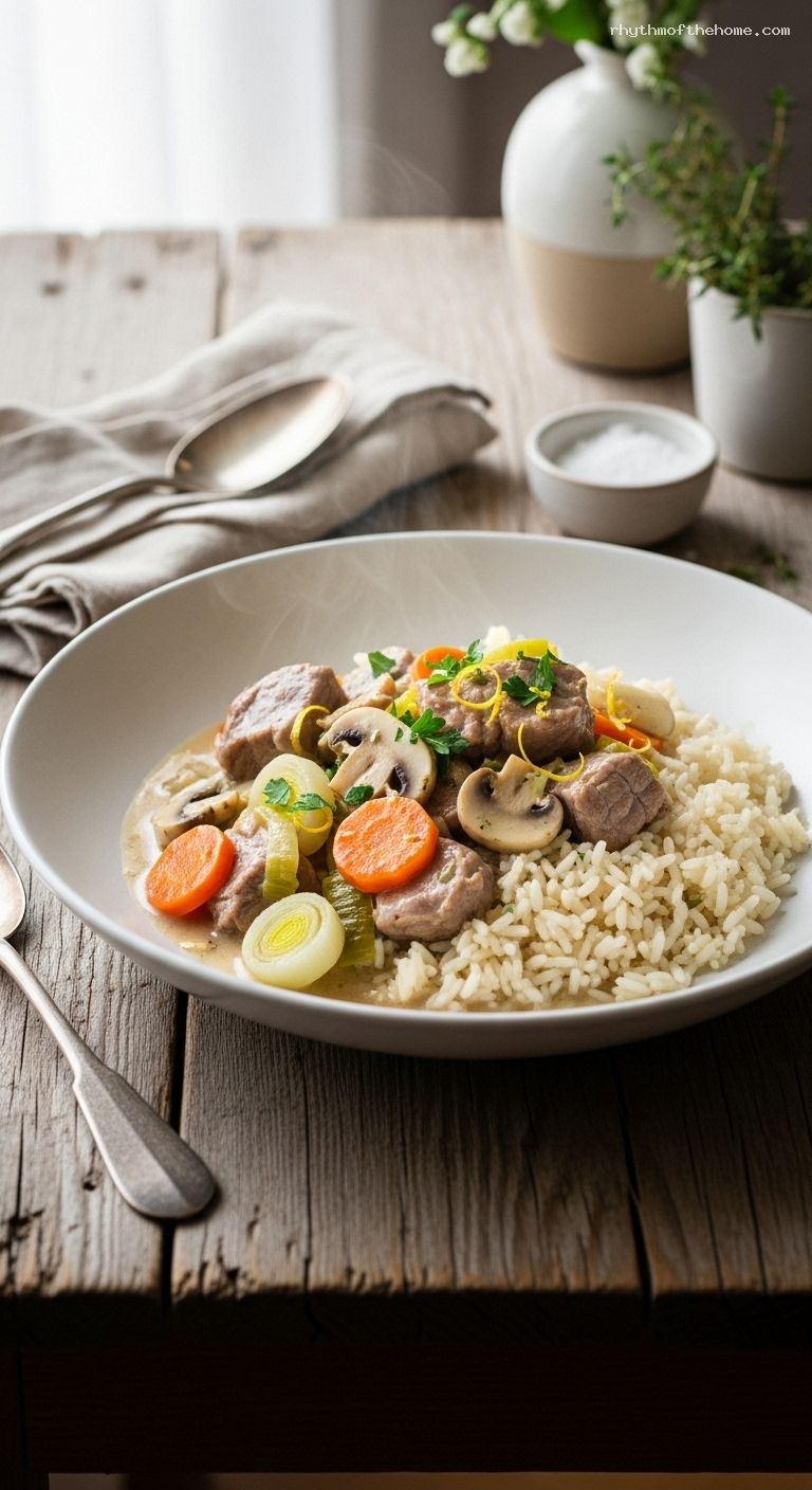 Fold the veal, carrots, leeks, and mushrooms (plus a tablespoon of their cooking liquid for aroma) into the sauce. Warm gently for 3–5 minutes without boiling. Stir in the chopped parsley. Spoon buttery rice into shallow bowls and ladle the blanquette over the top. Serve immediately.