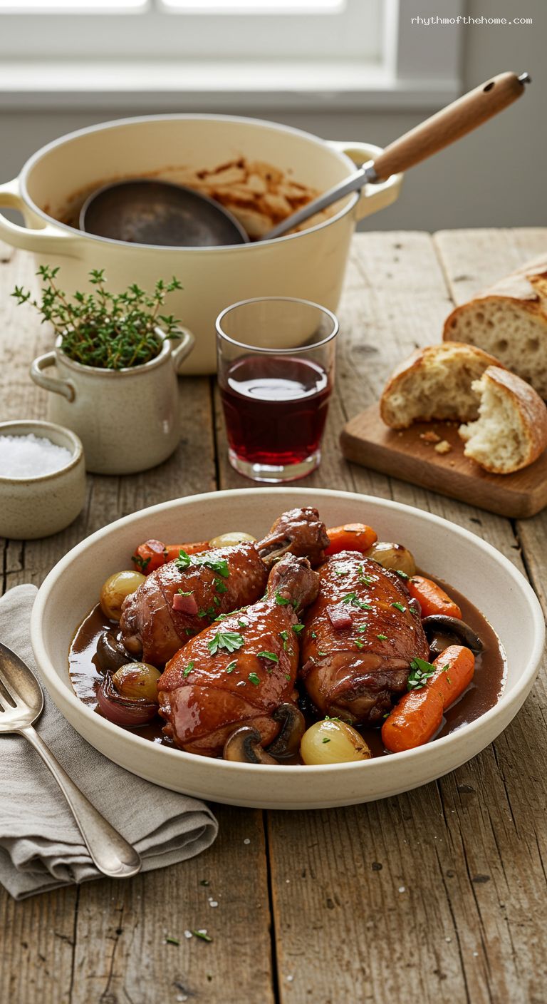 • Overnight Marinade: marinate chicken 8–24 hours in 2 cups red wine with onion, carrot, garlic, thyme, and bay; drain, pat dry, then proceed (richer color, deeper flavor).