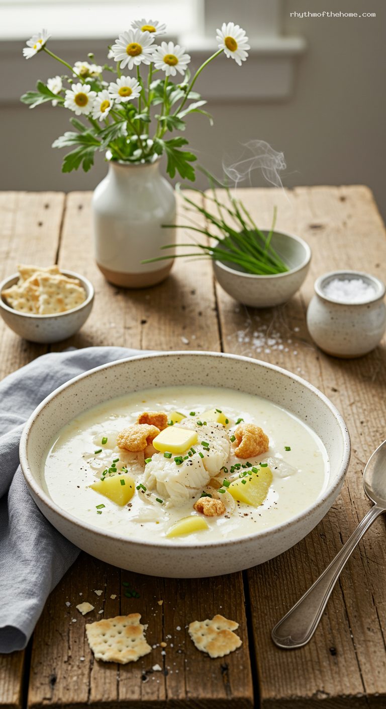 - Creamy, coastal New England flavor with flaky fish, buttery broth, and tender potatoes.