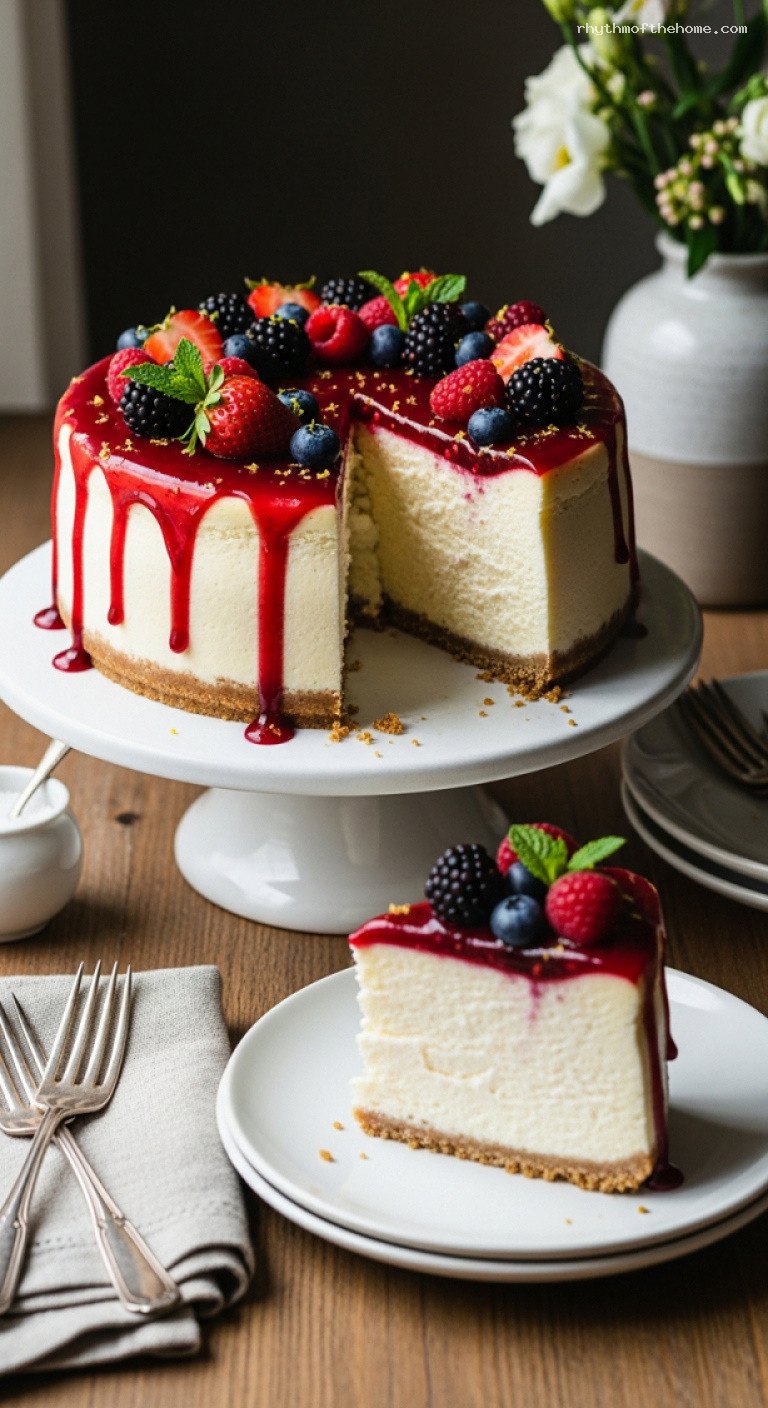 - Bright, tangy mixed-berry compote that perfectly balances the rich cheesecake.