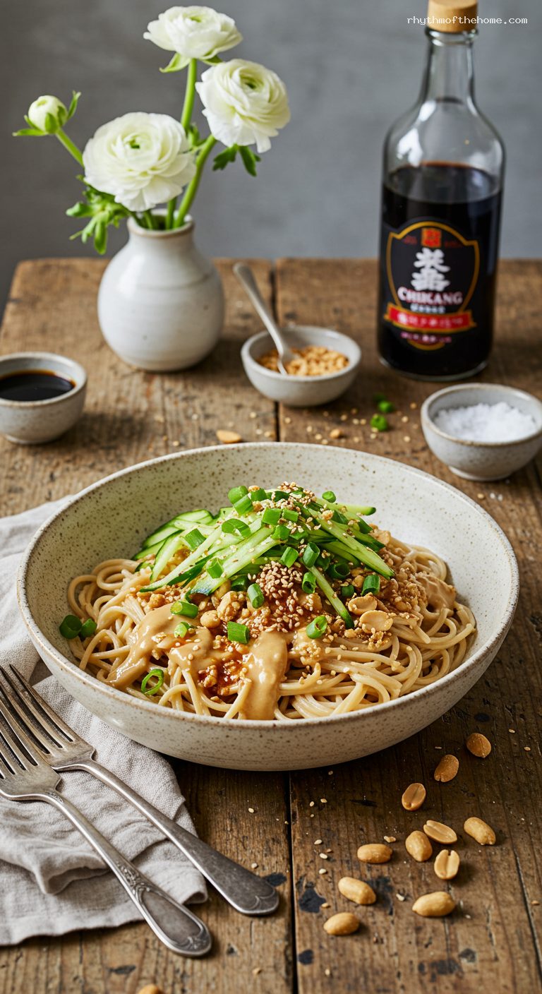 Pour the remaining sauce over the cooled noodles and toss vigorously until every strand is evenly coated and glossy. Fold in the shredded cucumber and most of the scallions (reserve some greens for garnish). If the sauce feels too thick, splash in 1–2 tablespoons cold water and toss again; if too loose, add a spoonful more peanut butter or tahini and whisk in before adding.