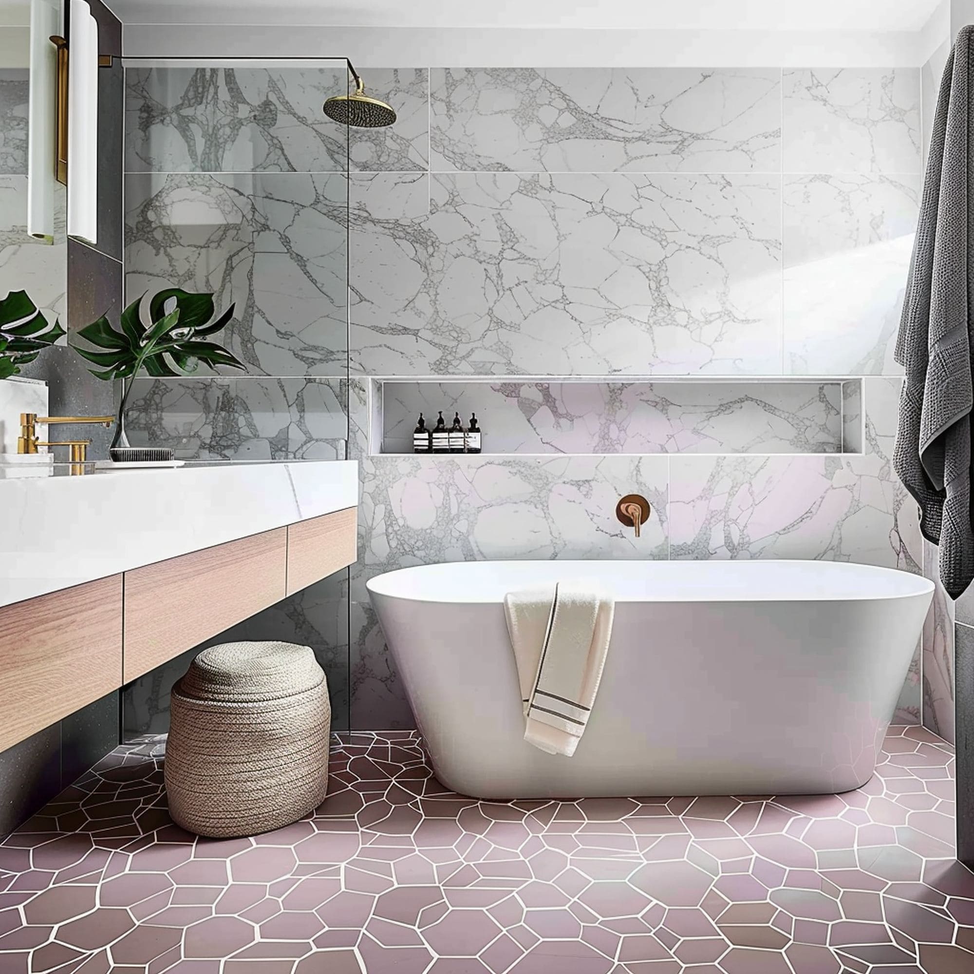 Many people like the color purple but integrating it into home decor isn’t an easy job. Instead of going for a very bold shade, consider trying out a softer purple tone for a balanced color scheme. This bathroom offers a great example because the light mauve used on the floor pairs elegantly with the soft gray from the marble. It results in a fairly neutral look but with the added benefit of a fresh personality. Pale lilac also works nicely if you wish to add a splash of color to your light gray color scheme.