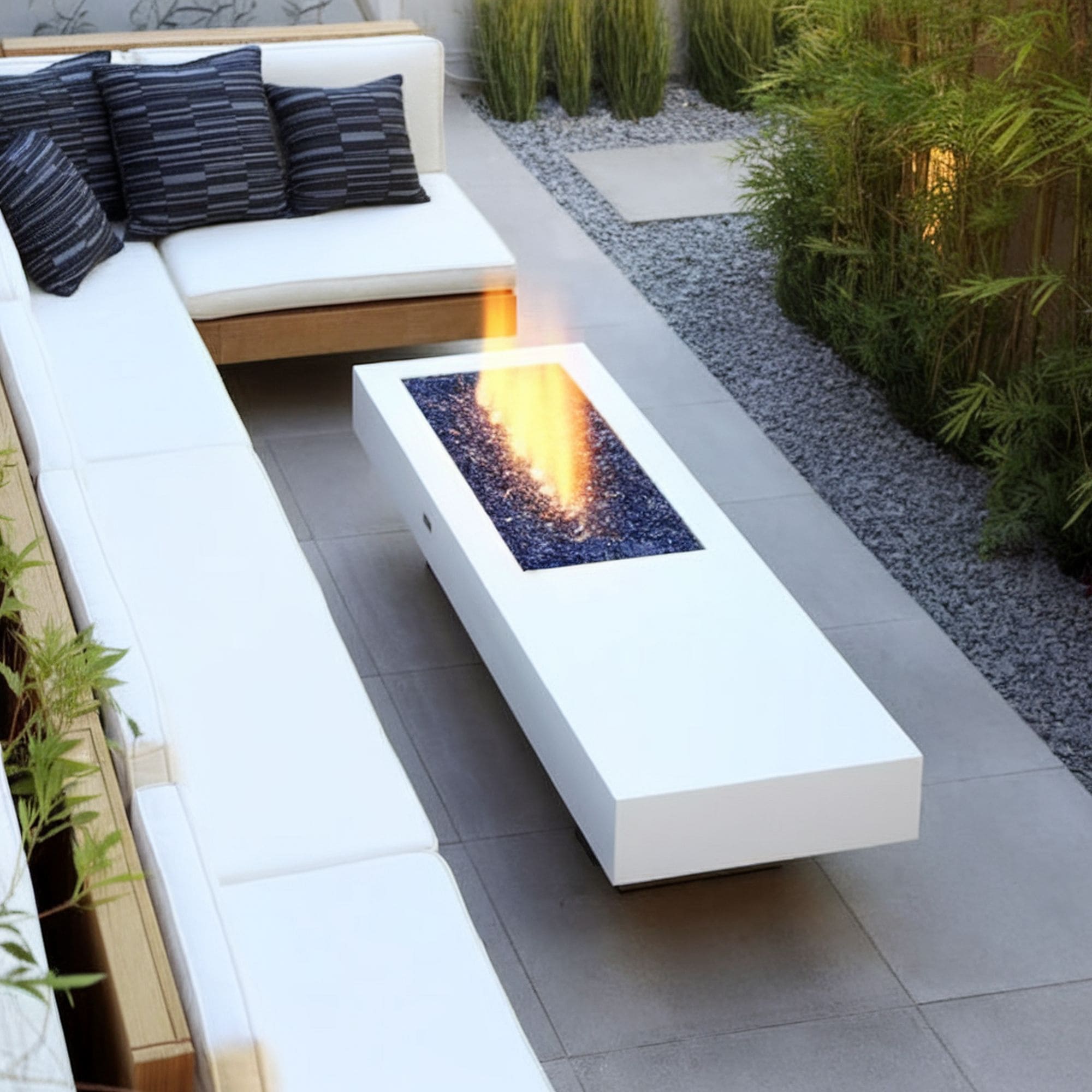 A good solution to try is mirroring the geometry of the concrete floor to the furnishings you’re using on the patio. For example, the clean lines of the outdoor sofa and table here make a stunning impression if you’re aiming for a modern concrete patio. The addition of a small firepit is inspired because it makes the area cozier.