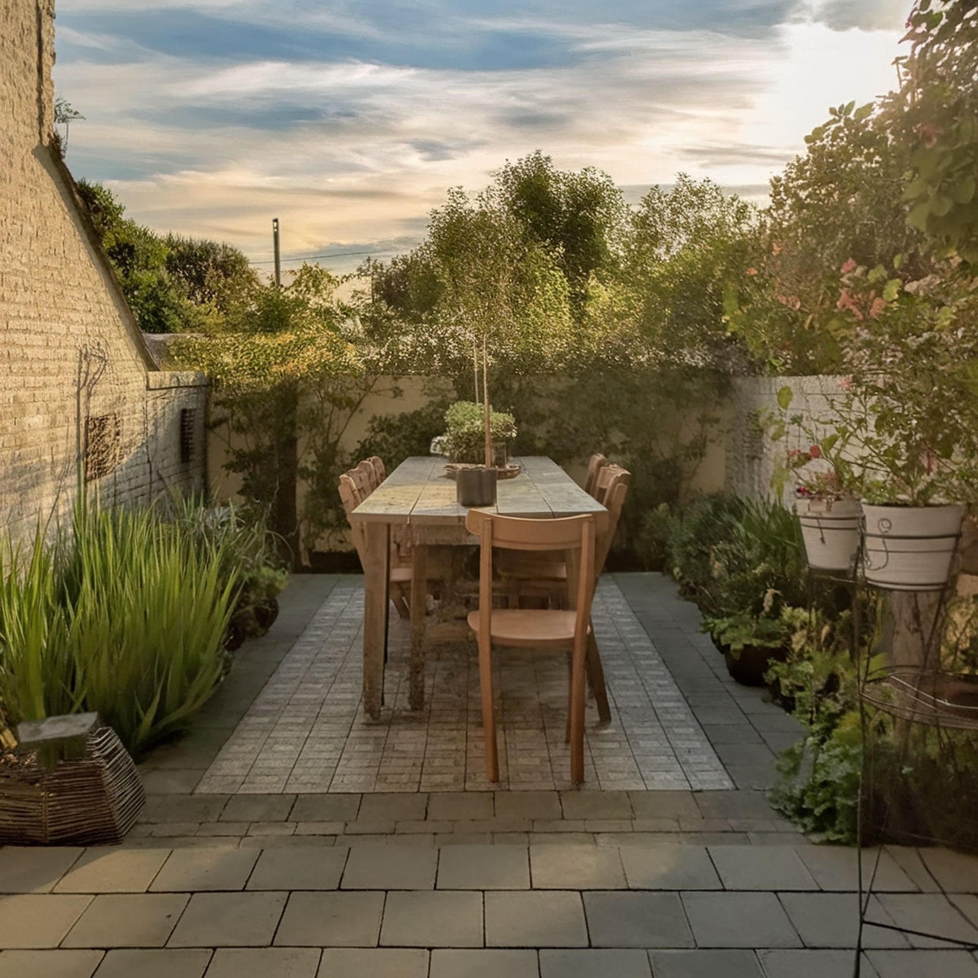 Try setting up the patio pavers in geometric patterns with some gaps filled with gravel for a contrasting textural effect. The best part is that this kind of concrete patio idea can be quite inexpensive. The gravel also gives you further decorative opportunities by including some low-growing foliage or patio trees.